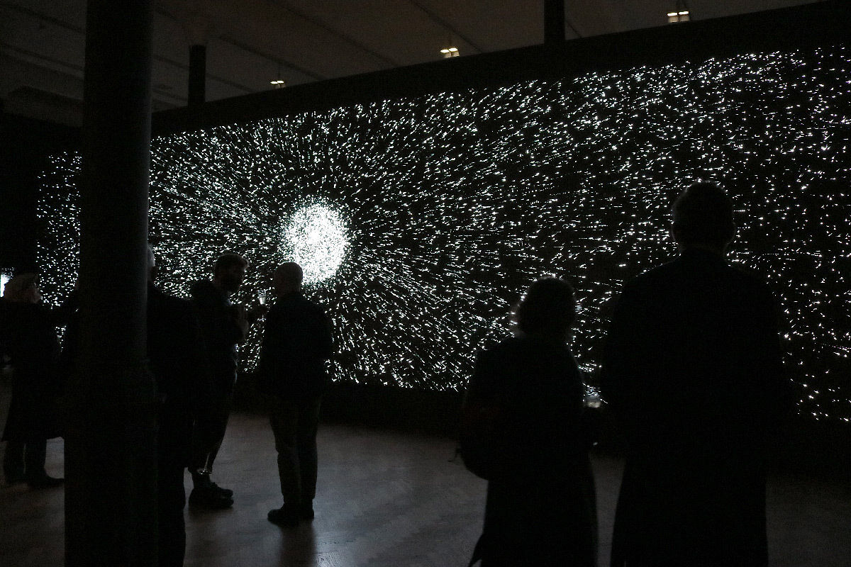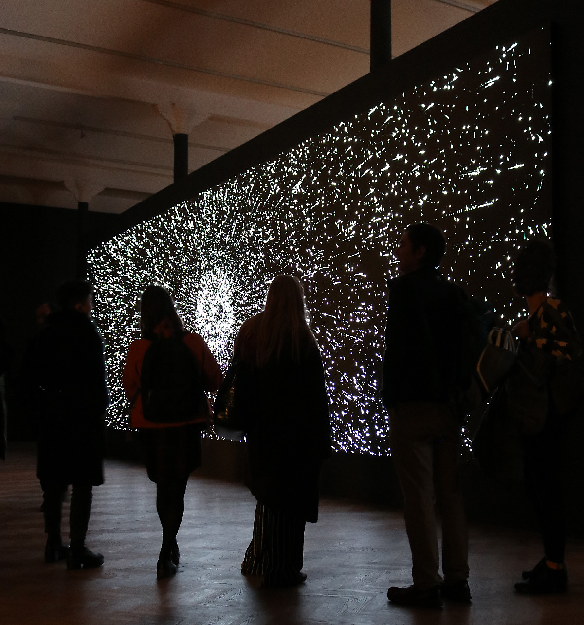 Ces œuvres écrans créent des champs ondulés de luminescence sur fond noir. La myriade de pixels blancs chorégraphiés par Leo Villareal capte immédiatement l’attention. Du cosmique à l’atomique, elles suggèrent des phénomènes astronomiques. Comme si le tamisage des étoiles, des galaxies, des explosions, des nébuleuses et la Voie lactée se produisait devant nos yeux éblouis :