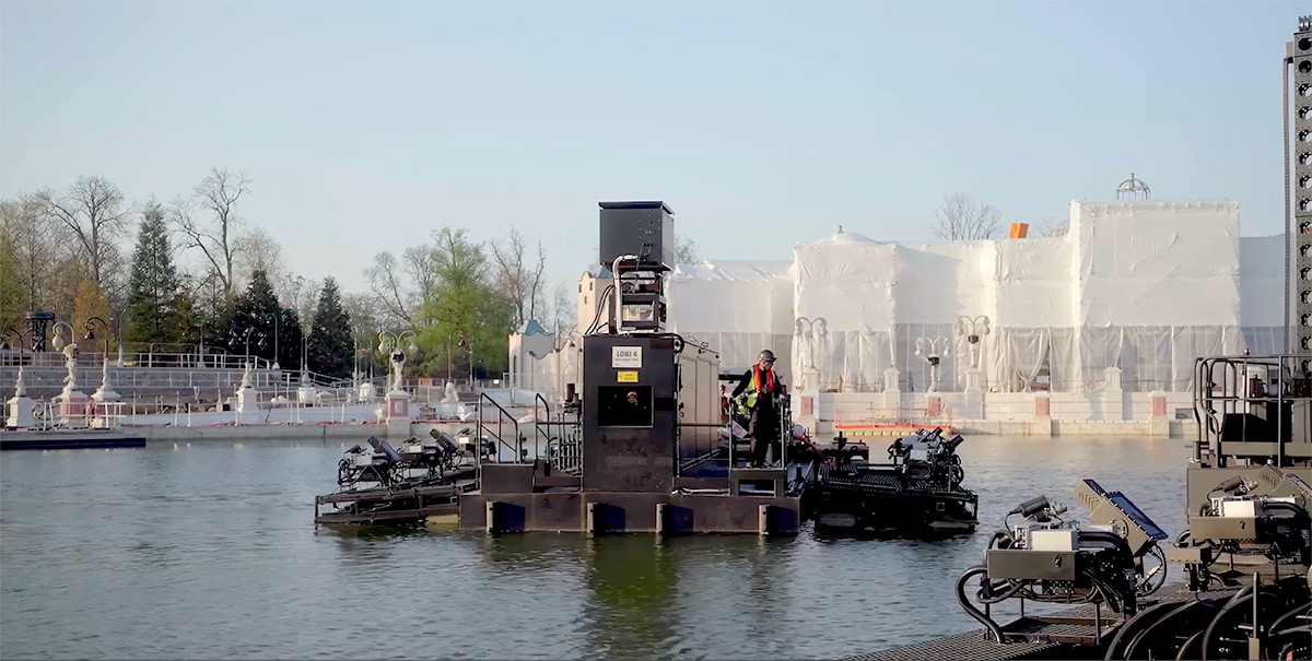 La zone du lac étant fermée pendant le chantier, les répétitions ont eu lieu la nuit. En coulisses, la structure flottante est déplacée depuis la marina par des remorqueurs entièrement électriques.