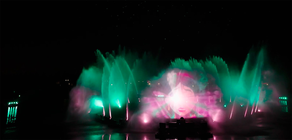 Le spectacle utilise 26 têtes de flamme, chacune est capable de produire des flammes d’environ 12 mètres. Leurs effets lumineux sont intégrés à la structure centrale des barges du spectacle. En coordination avec la chorégraphie, elles jouent avec l’eau et des drones.