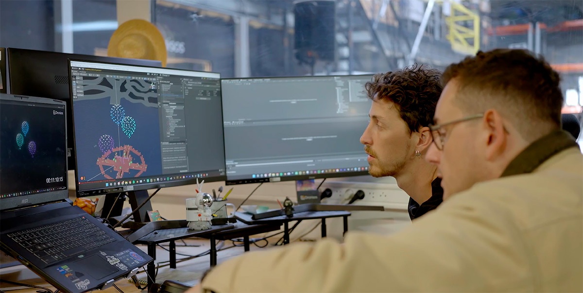 Les équipes communiquent via des casques d’interphone. Le show commence lorsque le responsable du spectacle donne le feu vert et que le régisseur lance le timecode. Ensuite, les systèmes s’exécutent automatiquement, tandis que les équipes surveillent en direct et répondent si besoin.