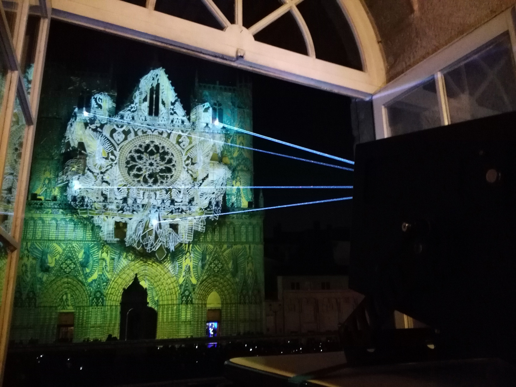 « Le tissage et la production textile sont à l’origine de la scénographie lumière réalisée par Casa Magica. La projection d’images sur la cathédrale utilise une technique qui rappelle la mécanique et le geste des tisseurs. De grands projecteurs, comme une énorme machine à tisser, réalisent toutes sortes de tissus, en lien avec l’iconographie de la trame et des réseaux. Un autre projecteur, plus petit, plus alerte que les précédents, représente la navette et vient perturber le parfait ordonnancement. Les artistes de Casa Magica ont également conçu la coloration du chevet de la cathédrale, de la basilique de Fourvière et du Palais de Justice ».