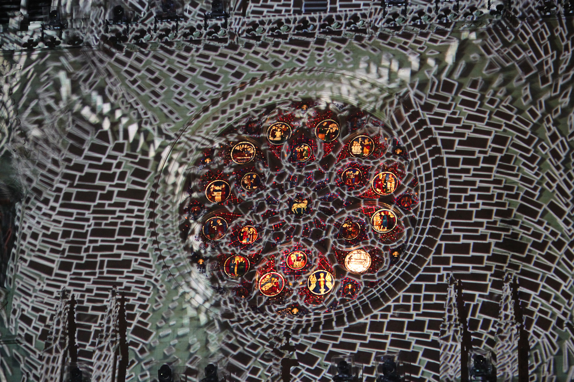 « Un hommage aux bâtisseurs qui, à partir du XIIème siècle, mettront plus de 300 ans pour ériger la cathédrale. Fil rouge de cette scénographie visuelle et sonore, deux mains gigantesques pétrissent la façade de la cathédrale. Des contours primitifs à l’esquisse finale, des effets spectaculaires et d’un grand réalise vous feront découvrir toutes les richesses de ce patrimoine ».