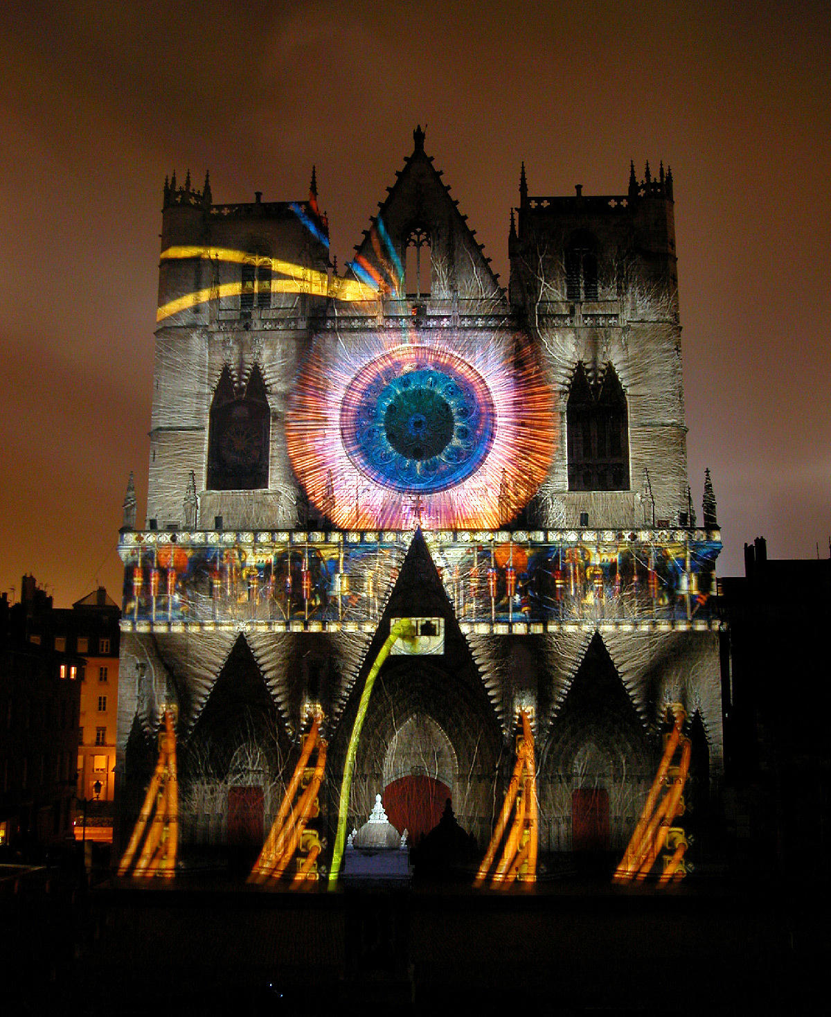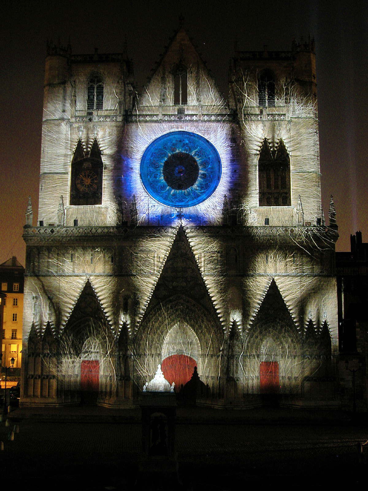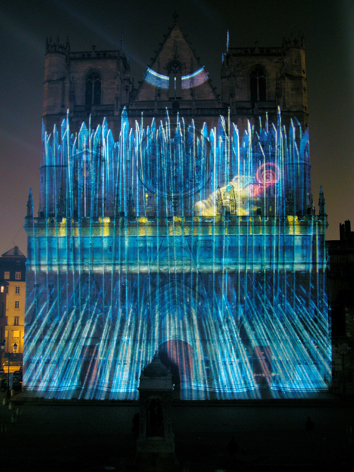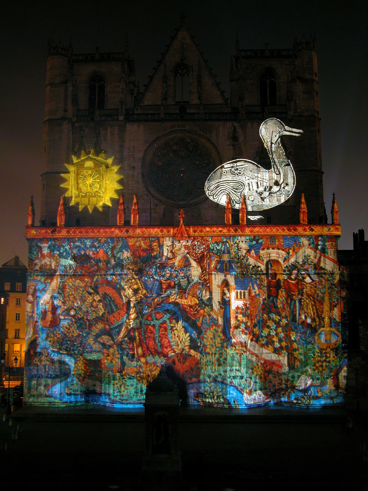 « Dans les livres d’histoire, tout indique que les cathédrales étaient jadis colorées. La cathédrale de Lyon se retrouve telle qu’en ses origines grâce au système d’illumination polychromatique dit chromolithe. La statuaire des trois voussures mise en couleur et la voilà revenue au Moyen-Âge. Enrichie, d’une cinquantaine de statues d’époque, de fresques et de bas-reliefs venant compléter les trois tympans, la vénérable vieille dame retrouve sa jeunesse et son éclat. A ses pieds, la fontaine Saint-Jean, illuminée de bleu et de blanc, semble se prosterner, tandis que des chants grégoriens subliment sa renaissance ».