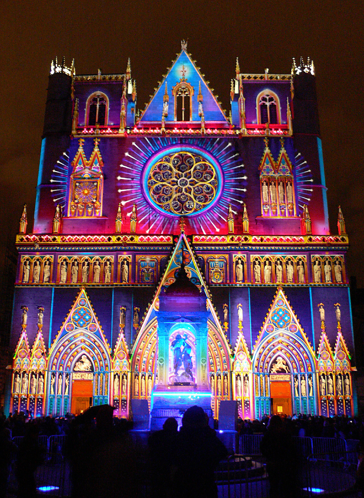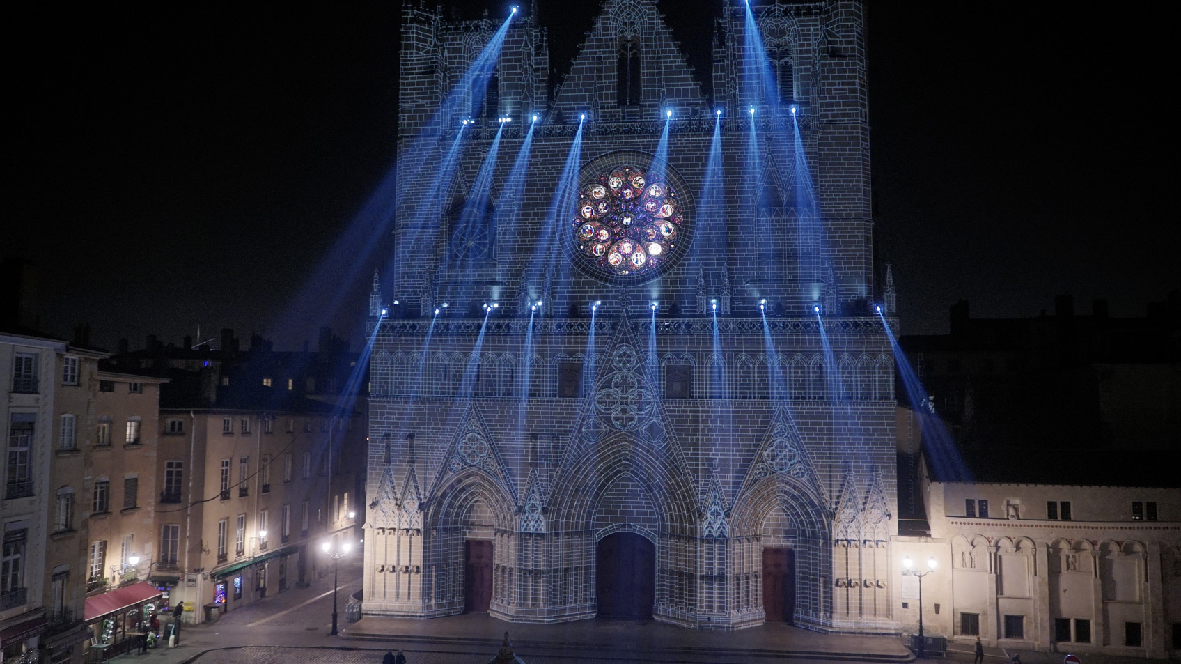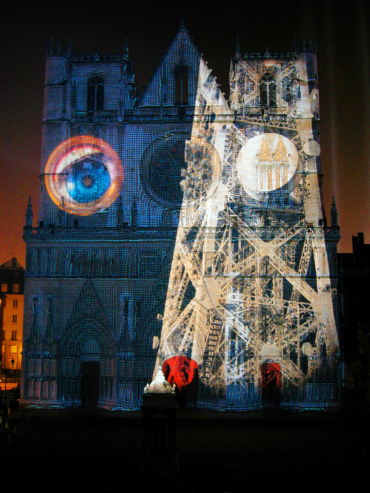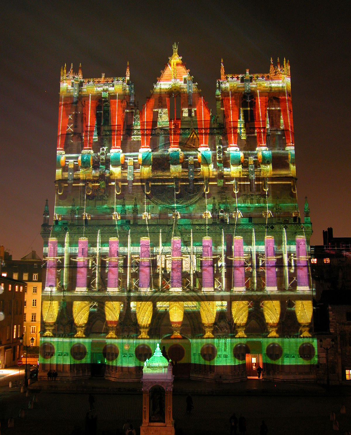 « Dans les livres d’histoire, tout indique que les cathédrales étaient jadis colorées. La cathédrale de Lyon se retrouve telle qu’en ses origines grâce au système d’illumination polychromatique dit chromolithe. La statuaire des trois voussures mise en couleur et la voilà revenue au Moyen-Âge. Enrichie, d’une cinquantaine de statues d’époque, de fresques et de bas-reliefs venant compléter les trois tympans, la vénérable vieille dame retrouve sa jeunesse et son éclat. A ses pieds, la fontaine Saint-Jean, illuminée de bleu et de blanc, semble se prosterner, tandis que des chants grégoriens subliment sa renaissance ».