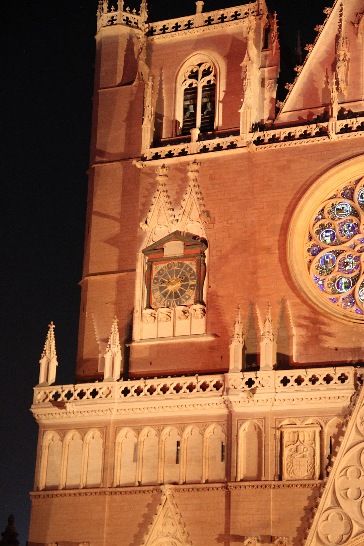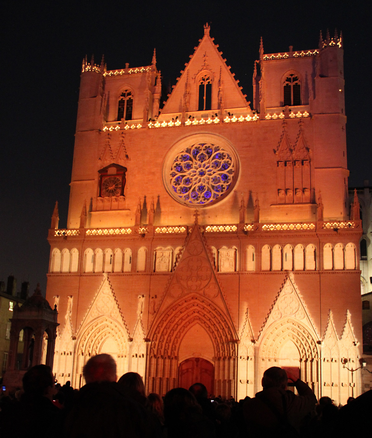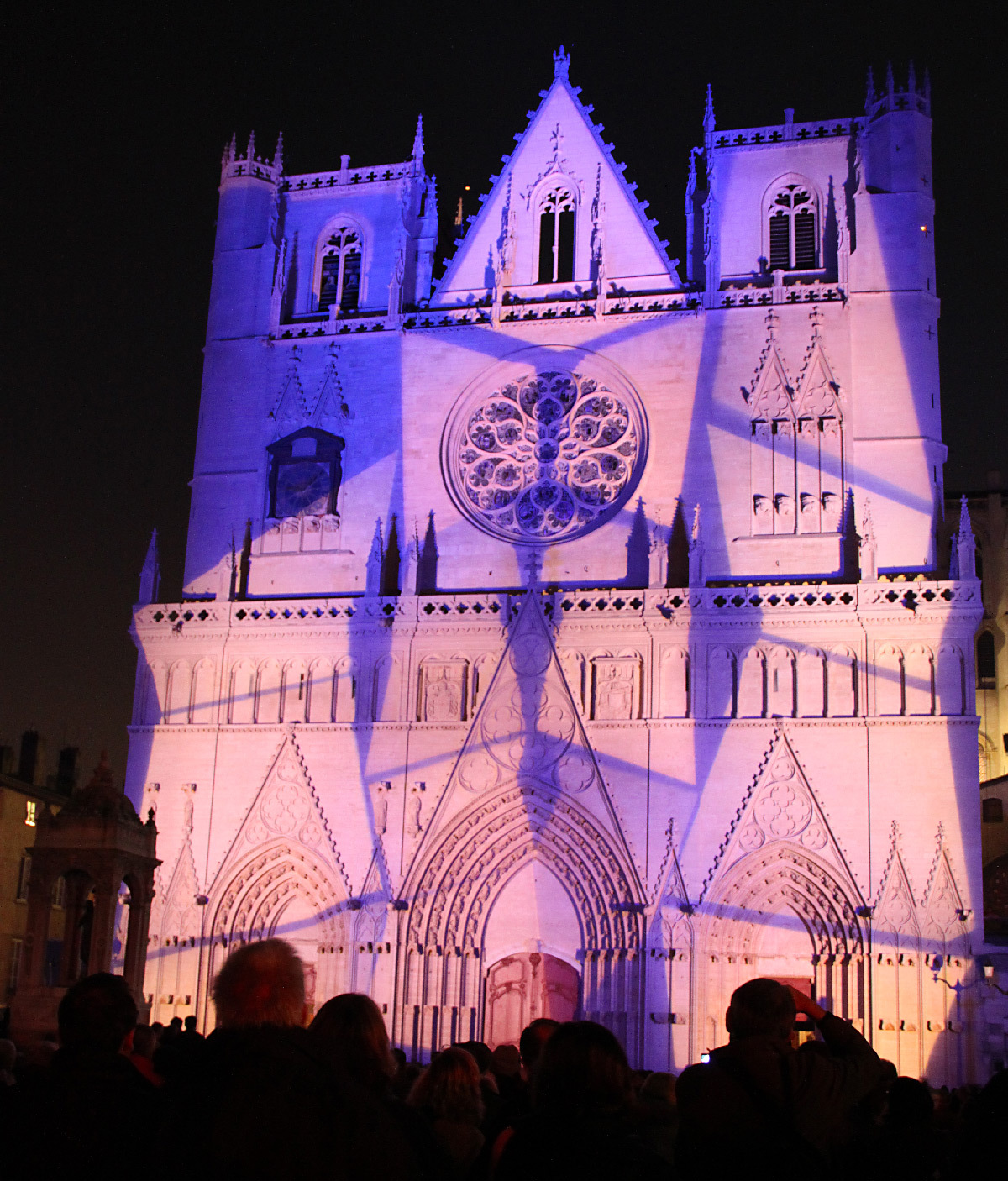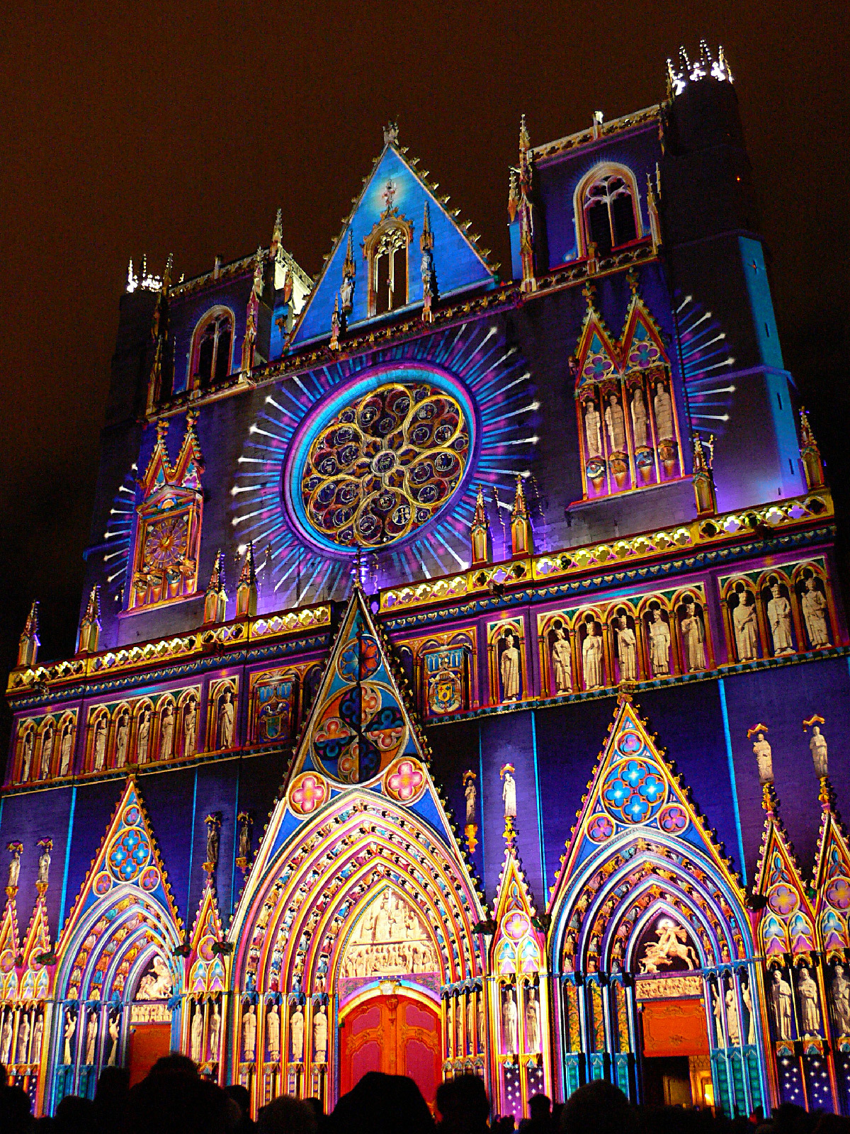 « Dans les livres d’histoire, tout indique que les cathédrales étaient jadis colorées. La cathédrale de Lyon se retrouve telle qu’en ses origines grâce au système d’illumination polychromatique dit chromolithe. La statuaire des trois voussures mise en couleur et la voilà revenue au Moyen-Âge. Enrichie, d’une cinquantaine de statues d’époque, de fresques et de bas-reliefs venant compléter les trois tympans, la vénérable vieille dame retrouve sa jeunesse et son éclat. A ses pieds, la fontaine Saint-Jean, illuminée de bleu et de blanc, semble se prosterner, tandis que des chants grégoriens subliment sa renaissance ».