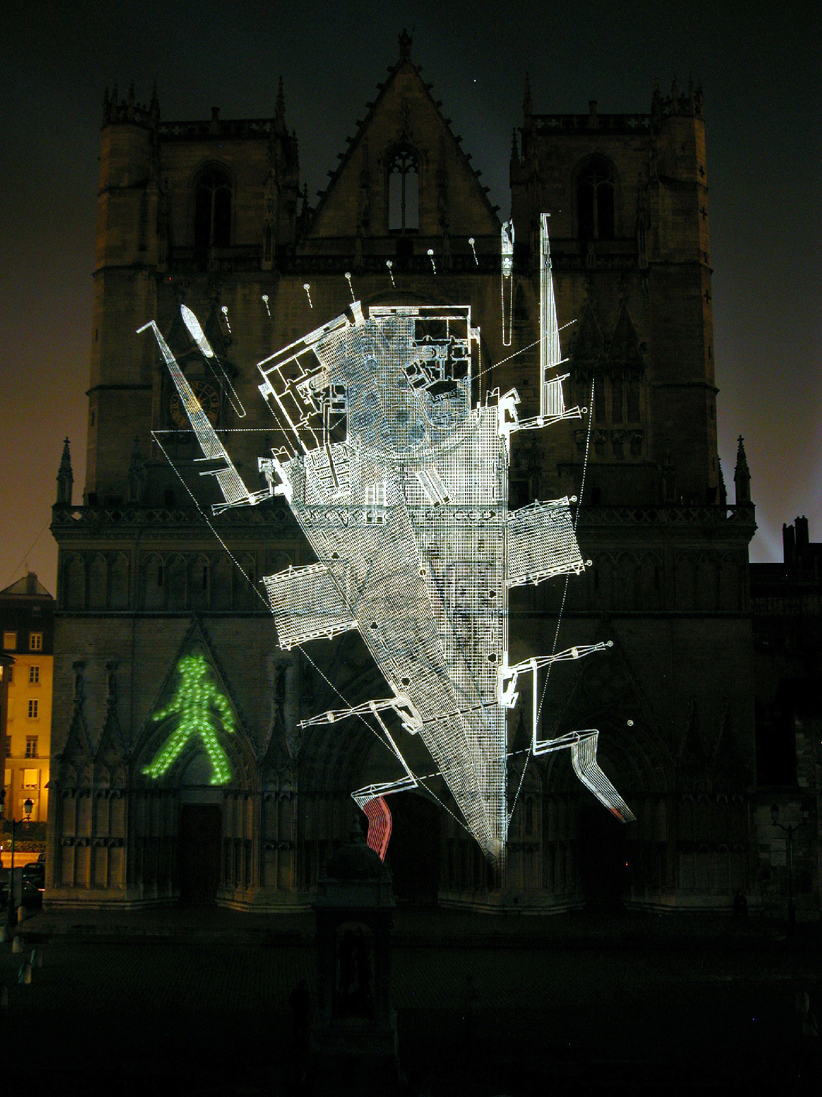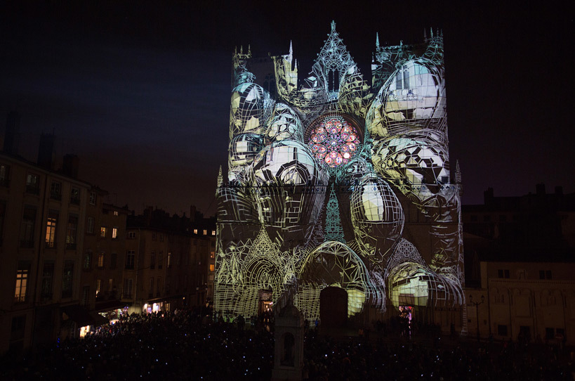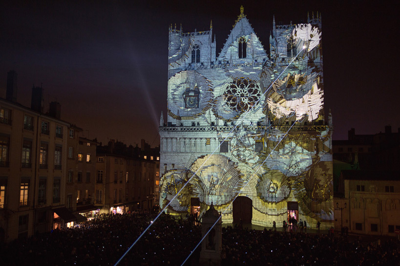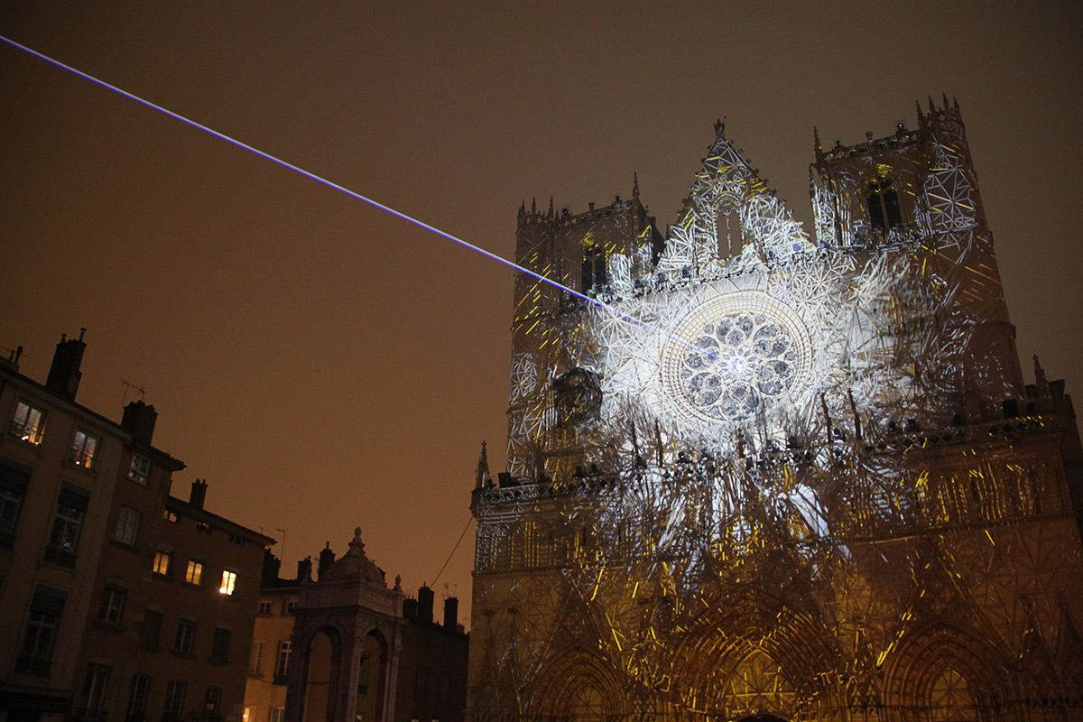 « Les blocs de pierre vacillent, les statues et gargouilles s’échappent des murs, s’enchevêtrent avec les vitraux et les rosaces… Lauréat du Trophée des Lumières de la Ville de Lyon, Damien Fontaine réinvestit la cathédrale Saint-Jean après le succès des “Bâtisseurs” en 2009. Il transfigure la façade en puisant dans ce que le monument recèle de plus précieux. Une parfaite osmose entre la projection monumentale, la lumière et le son ! »