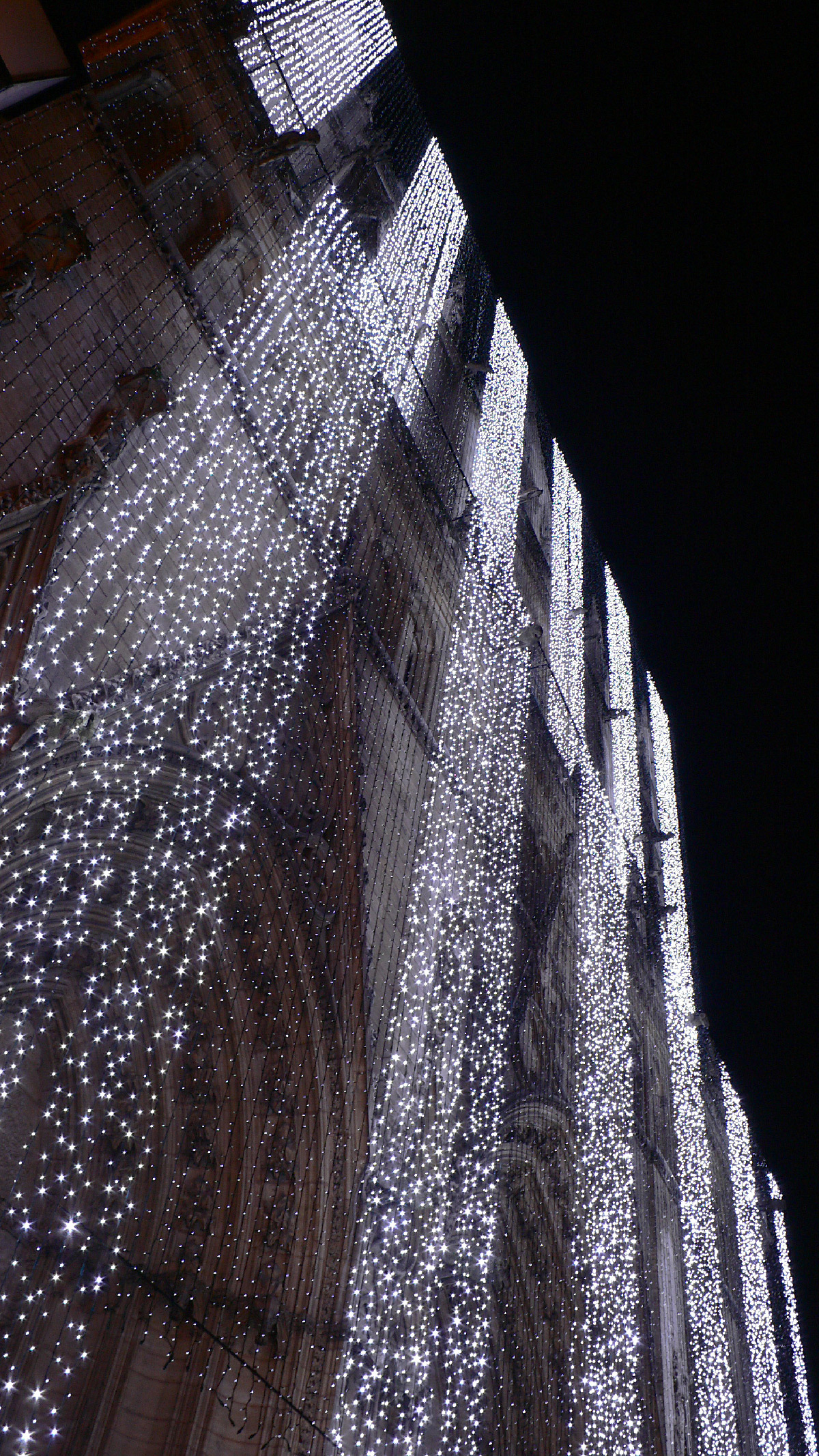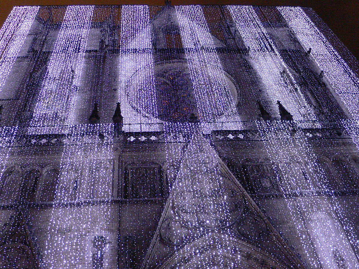 « En arrivant sur la place éclairée à 360° depuis un mystérieux monolithe, entrez dans un véritable bain de lumiere et découvrez avec un regard nouveau l’architecture de la cathédrale et des immeubles de la place. Les variations de couleurs, d‘intensité et de motifs tracent des cheminements à travers la ville, au son de compositions musicales entremêlées ».