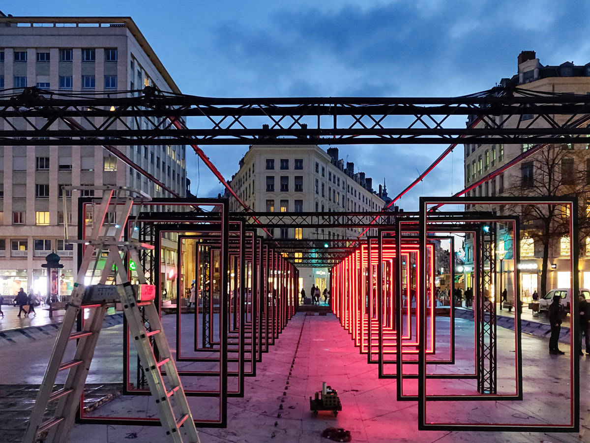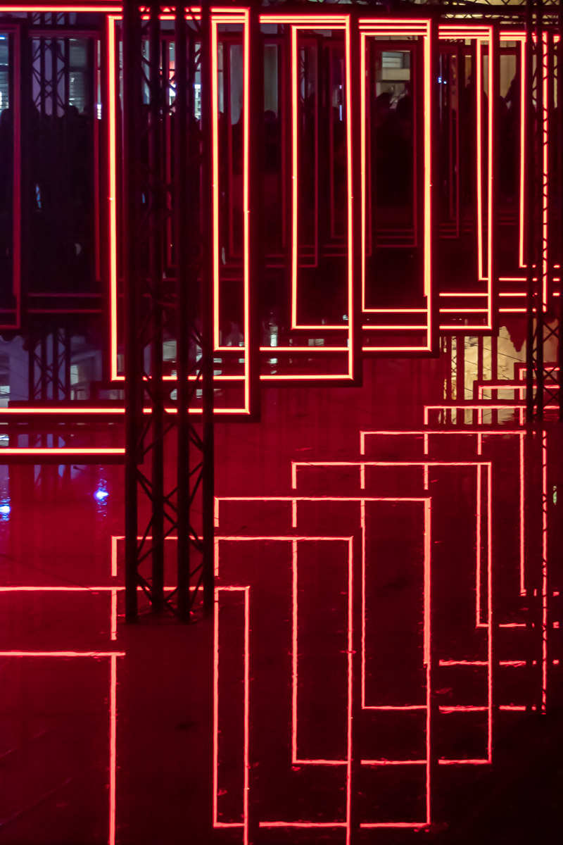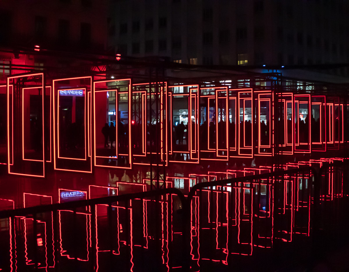 Comment transposer en extérieur une installation conçue pour une galerie ? Olivier Ratsi et son producteur, Crossed Lab, y parviennent avec succès. Deux séries de cadres en LED rouges monochromes sont installées en parallèle. Au-dessus du bassin de la place de la République à Lyon, par reflet sur l’eau, elles deviennent quatre.