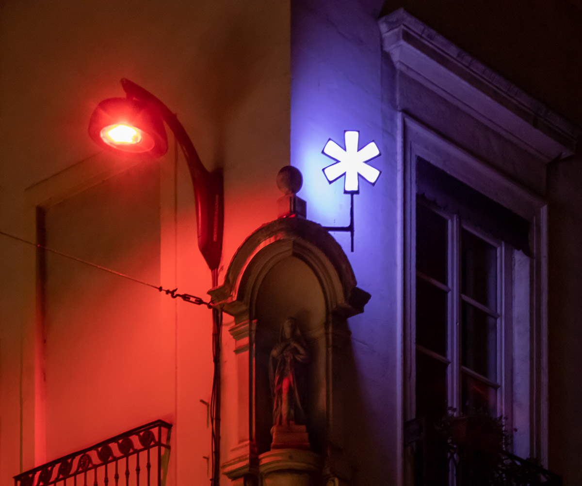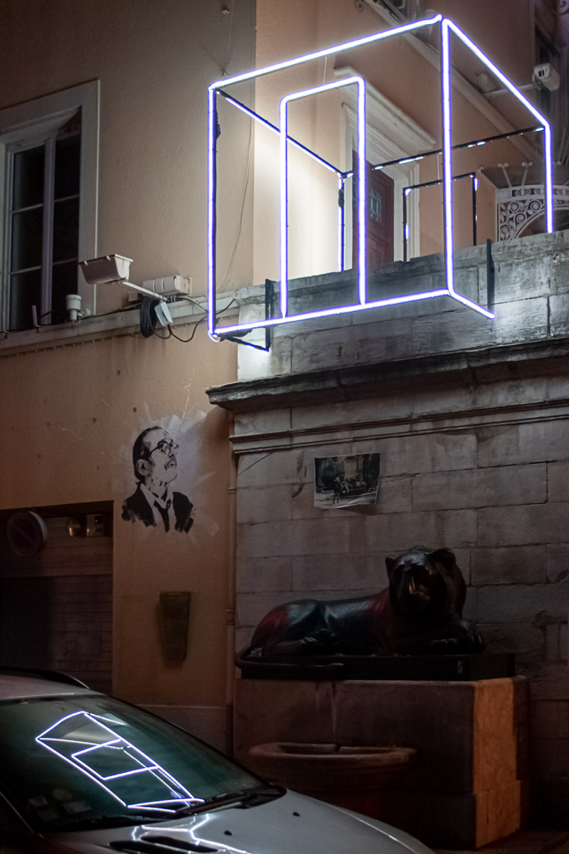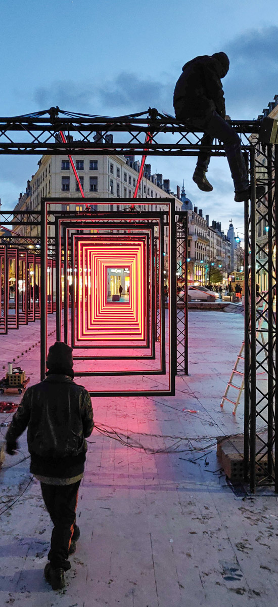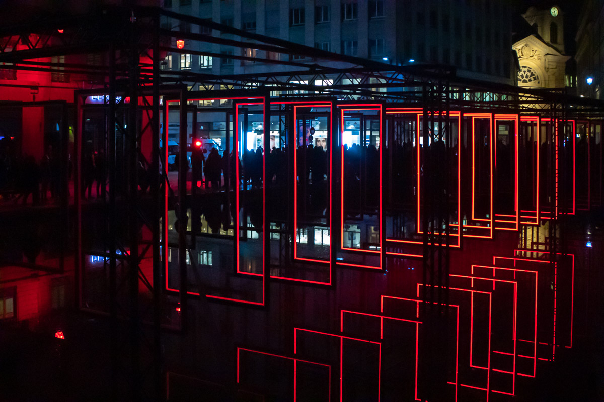 Comment transposer en extérieur une installation conçue pour une galerie ? Olivier Ratsi et son producteur, Crossed Lab, y parviennent avec succès. Deux séries de cadres en LED rouges monochromes sont installées en parallèle. Au-dessus du bassin de la place de la République à Lyon, par reflet sur l’eau, elles deviennent quatre.