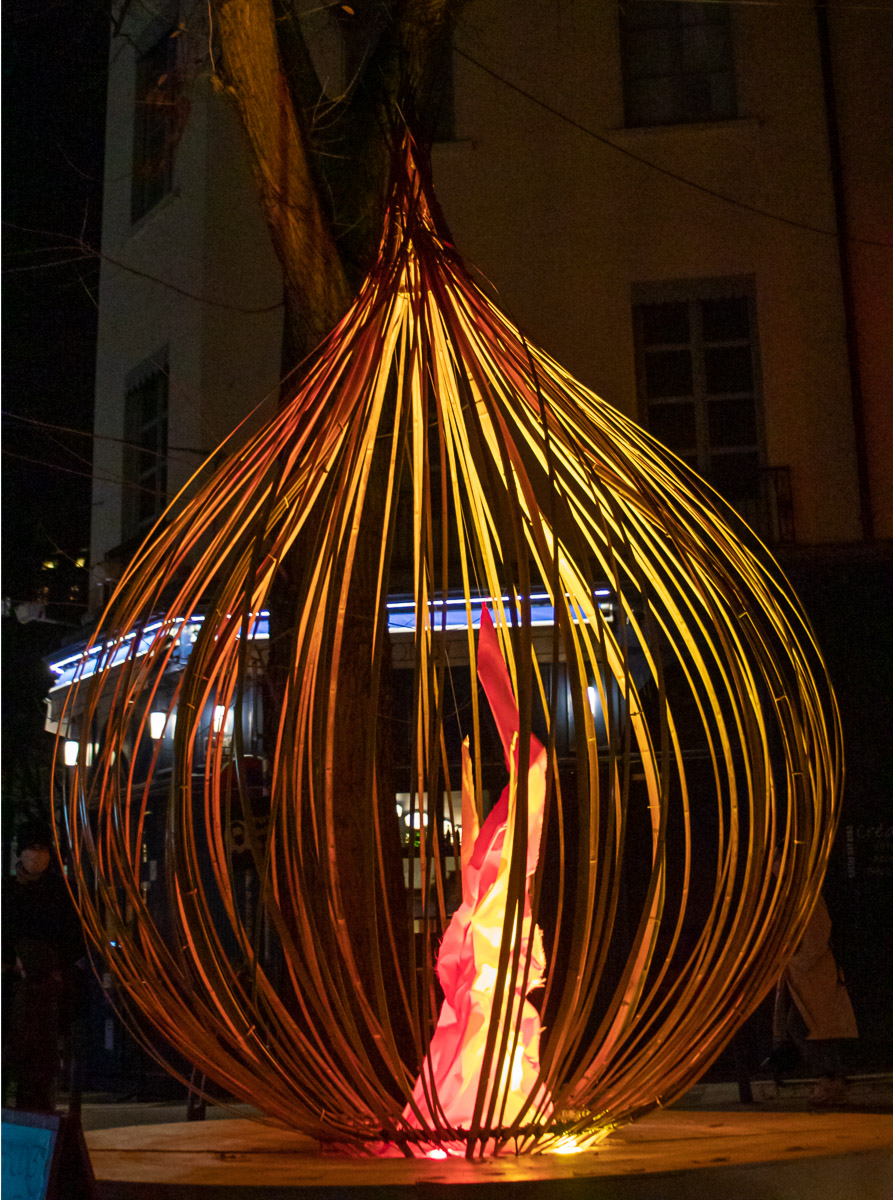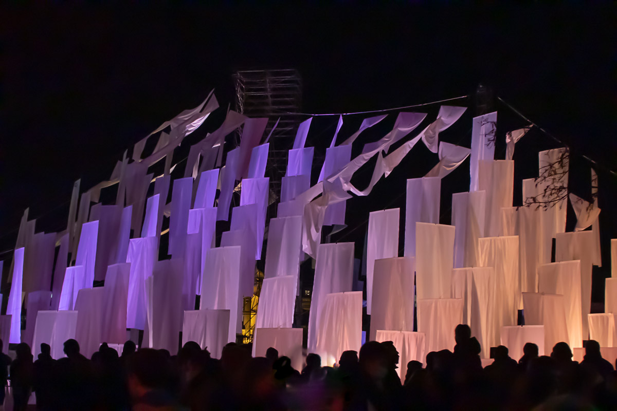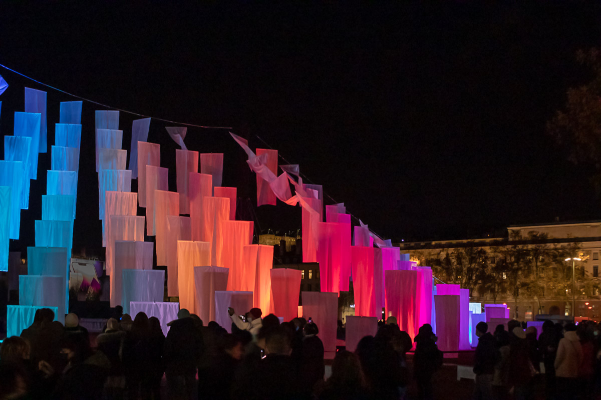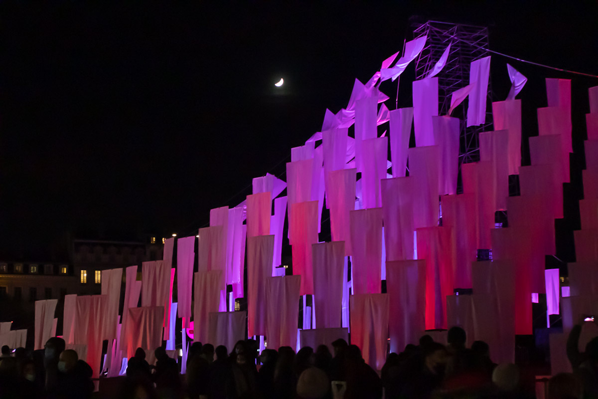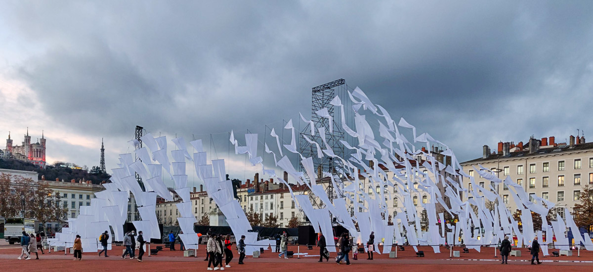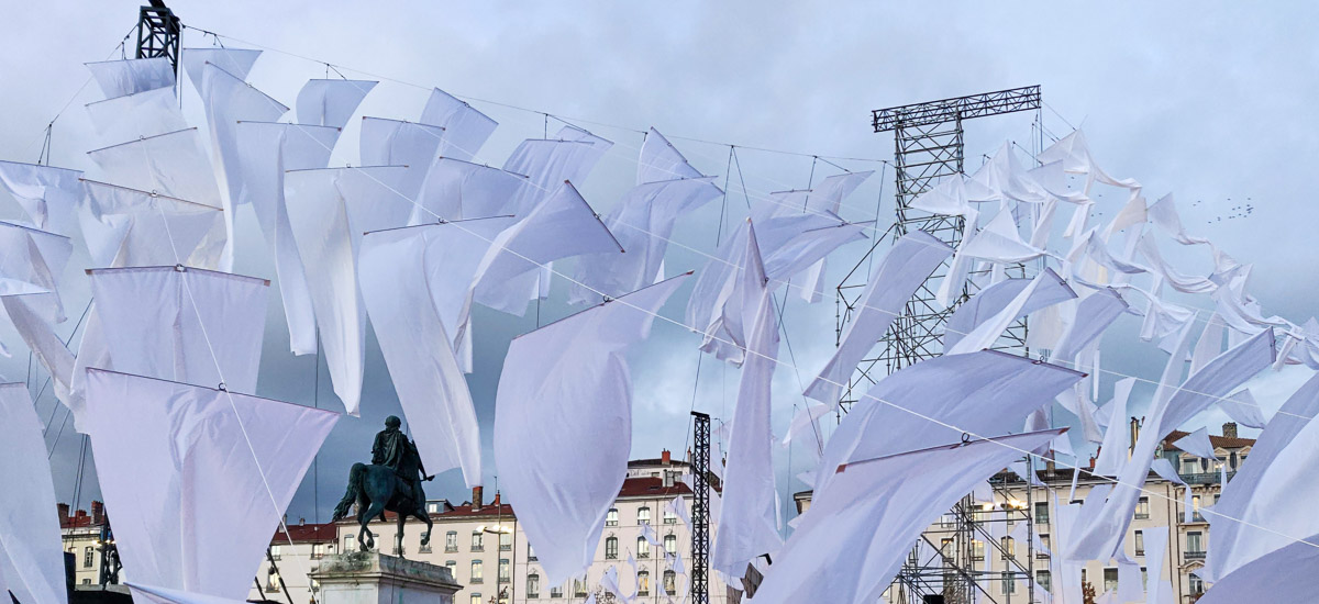 Land art à l’échelle de l’espace public, l’installation s’inscrit tout en finesse en centre-ville pour la Fête des Lumières. Telles les voiles démultipliées d’un bateau, elles flottent au vent, inlassablement.