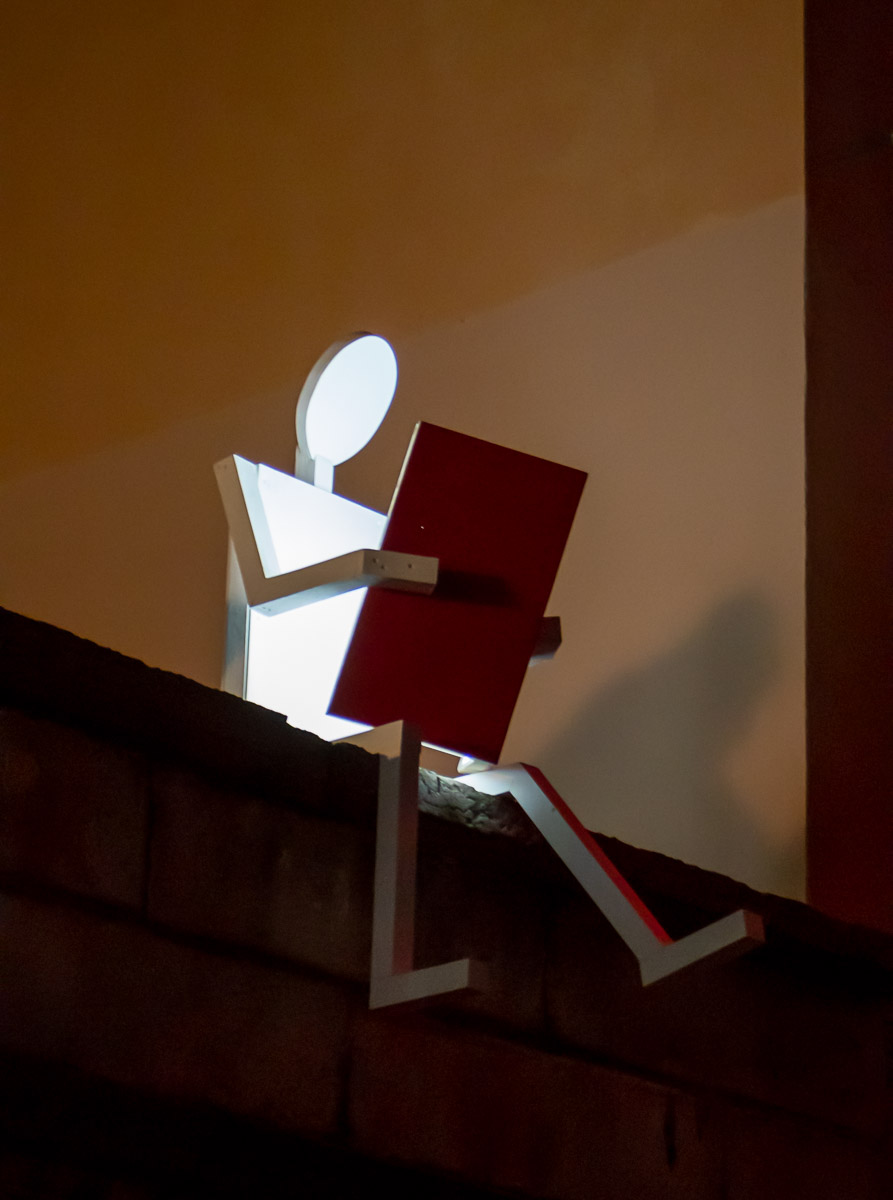 Simplicité et discrétion caractérisent cette installation de l’artiste hollandais Ralf Westerhof. Un oiseau sur le point de s’élancer est dessiné en fils de lumière blanche.