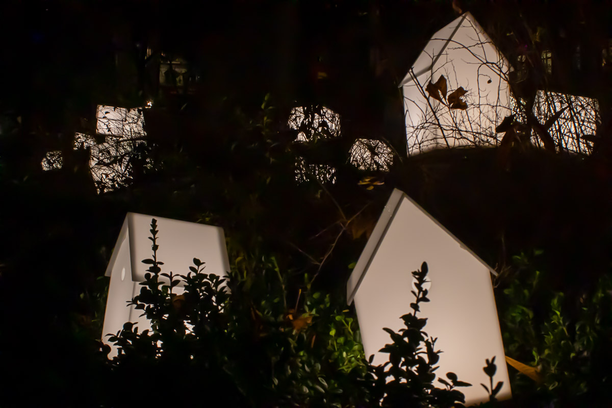 Tout en ombres et lumières, Ricochets combine harmonieusement deux effets de lumière. Tout d’abord, des anneaux luminescents flottants sur le lac. Ensuite, des projections d’images en noir et blanc sur le fond de la végétation du parc.