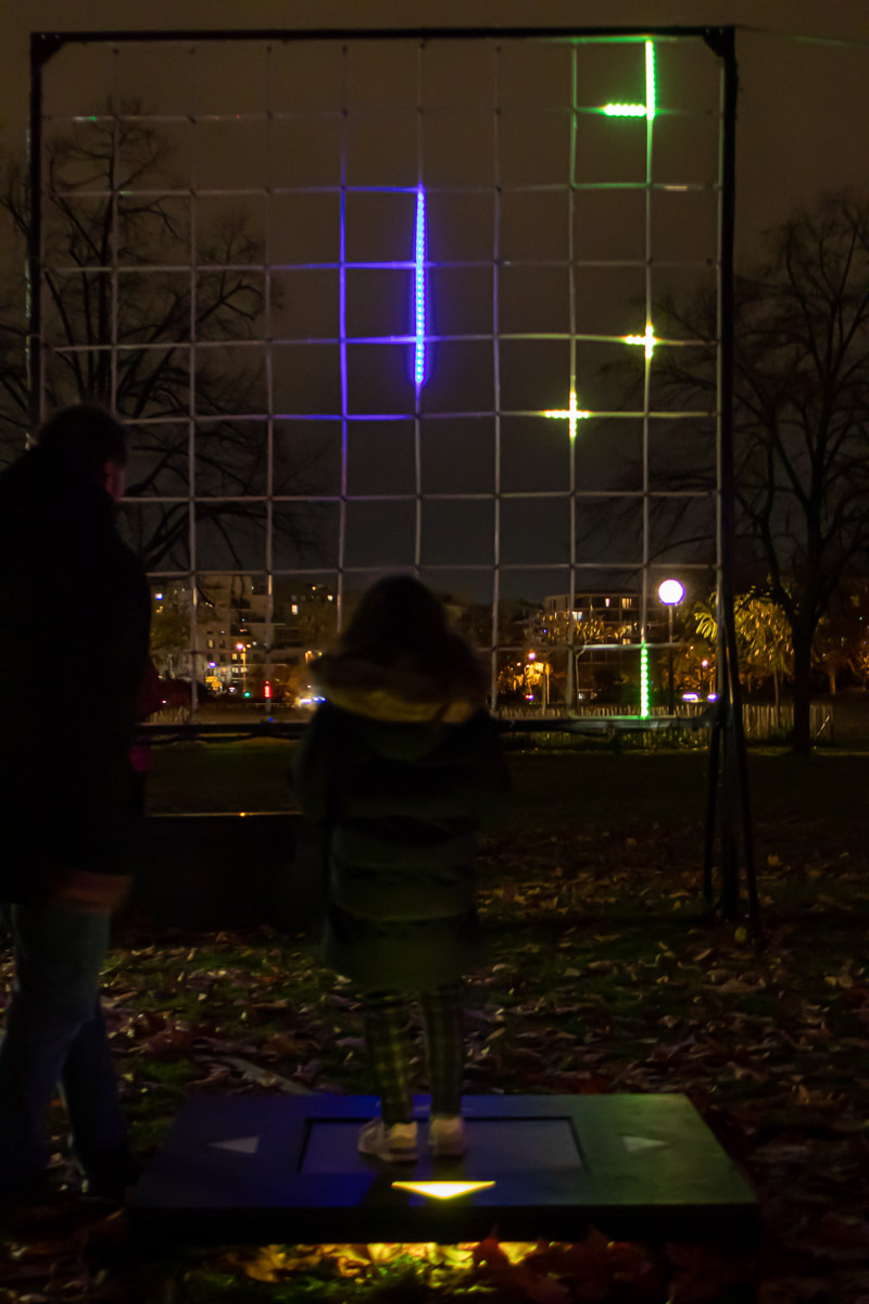 Cette dimension plaisir issue des premiers jeux vidéo est néanmoins bien plus simple. Il s’agit de donner la possibilité de déclencher un effet lumière selon le jeu, soit sur une surface verticale transparente, pour un jeu de morpion, soit à l’horizontale sur le sol, pour une marelle interactive. Des capteurs de poids sont mis en œuvre pour créer l’interaction lumière.