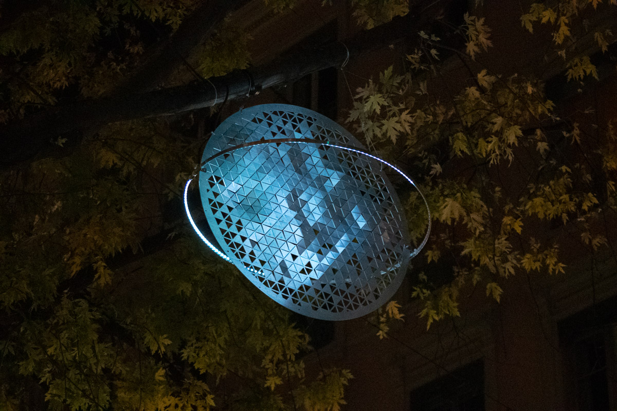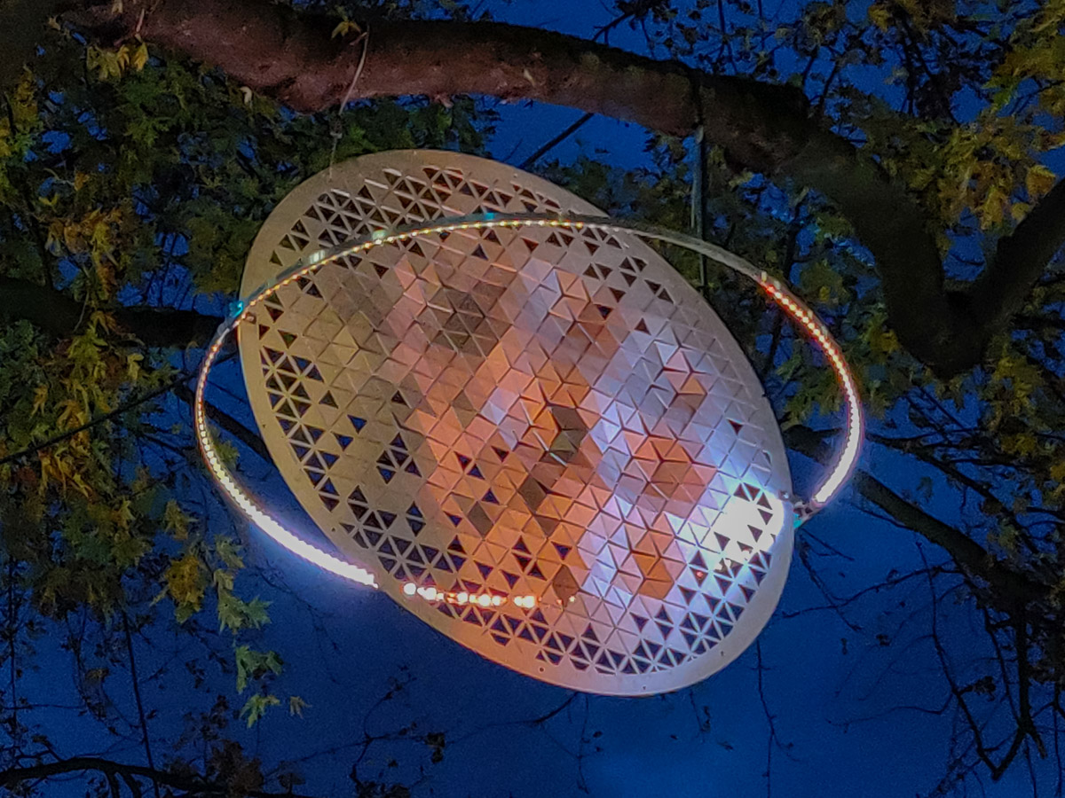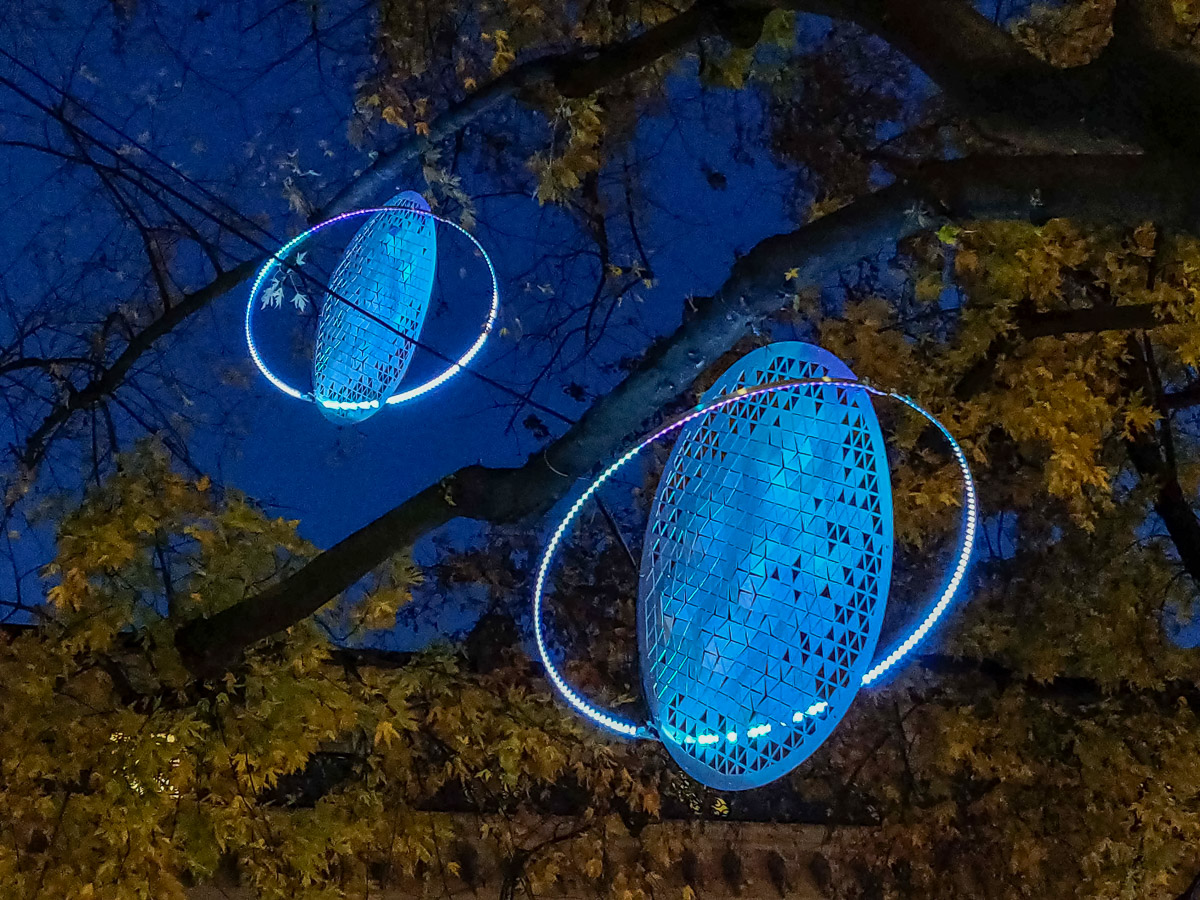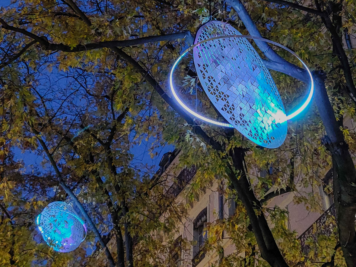 Autour d’un disque en aluminium perforé, un anneau de LED RVB entoure chaque planétoïde, comme pour la planète Venus. L’éclairage dynamique coloré donne à l’installation des variations de reflets et de brillance subtils. Telle une voie lactée imaginaire, un peu de poésie dans l’axe de la presqu’île de Lyon…