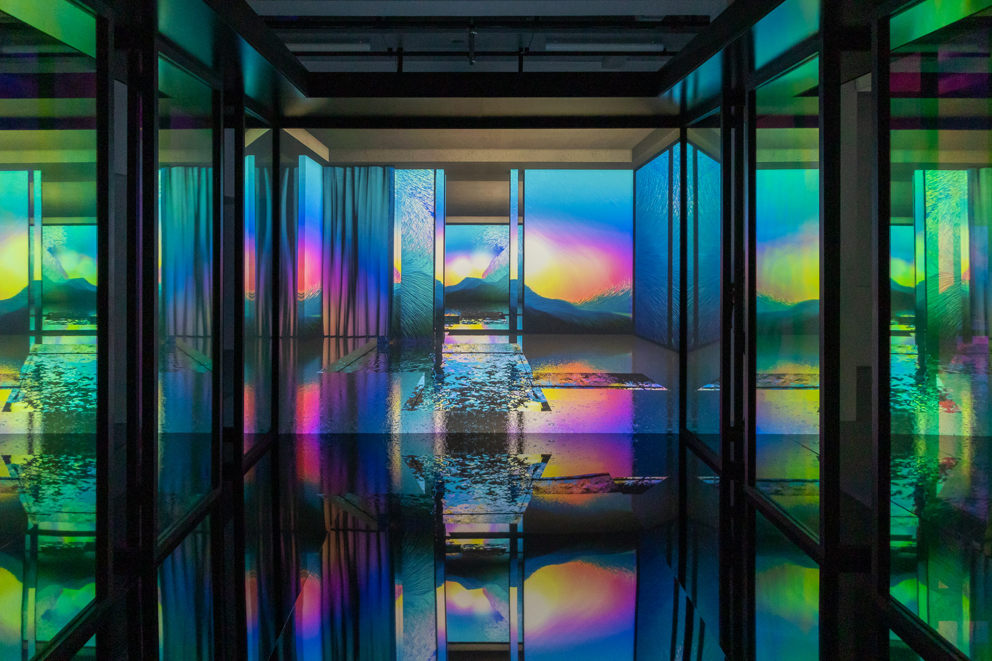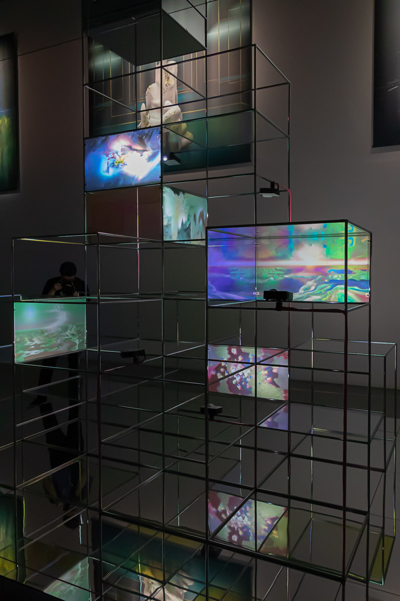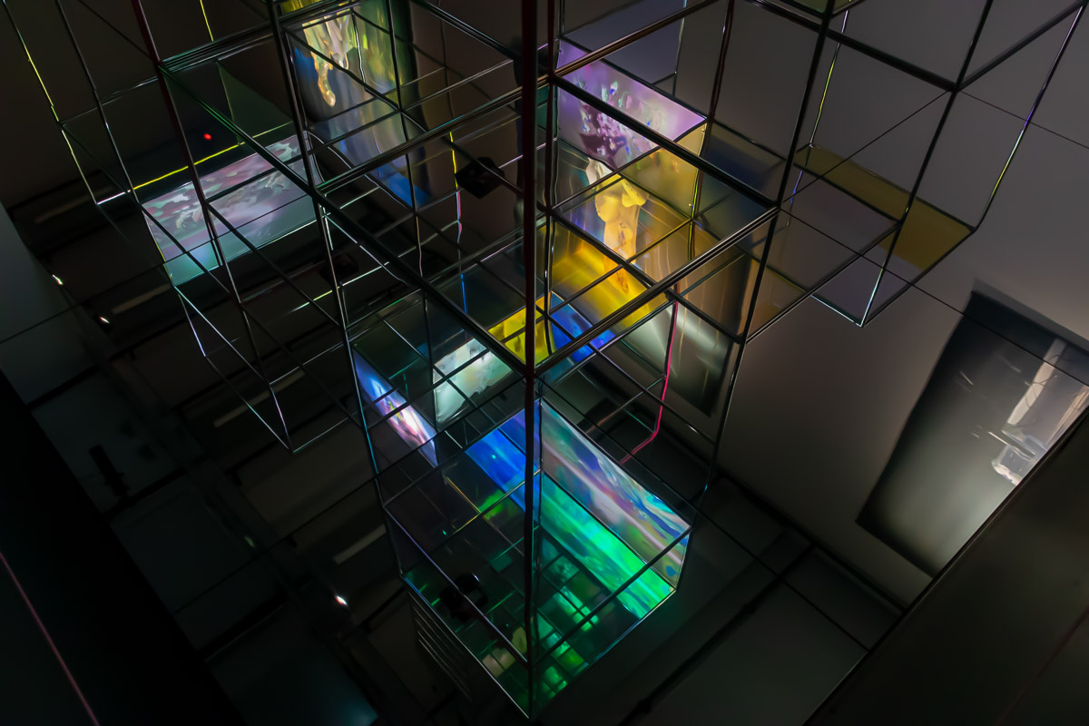 Dépassant du garde-corps, une tour d’écrans attire l’attention sur la droite. Lorsque l’on se penche vers Radiances, une profondeur infinie se reflète.