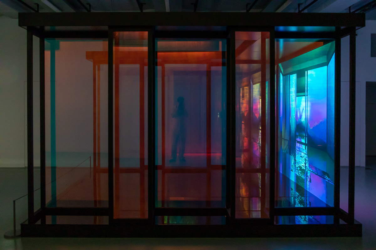 L’ensemble se réfléchit sur le sol miroir. Selon que l’on se trouve dans l’axe de l’installation ou sur le côté, il crée des jeux de colorisation intérieurs et extérieurs.