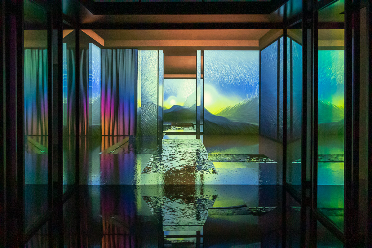 Au niveau -1, Alpenglow est un petit édifice japonisant. Dans le fond, un écran rétroprojeté présente un espace zen. Sa chromie évolue au fil du temps, des teintes froides aux teintes chaudes.