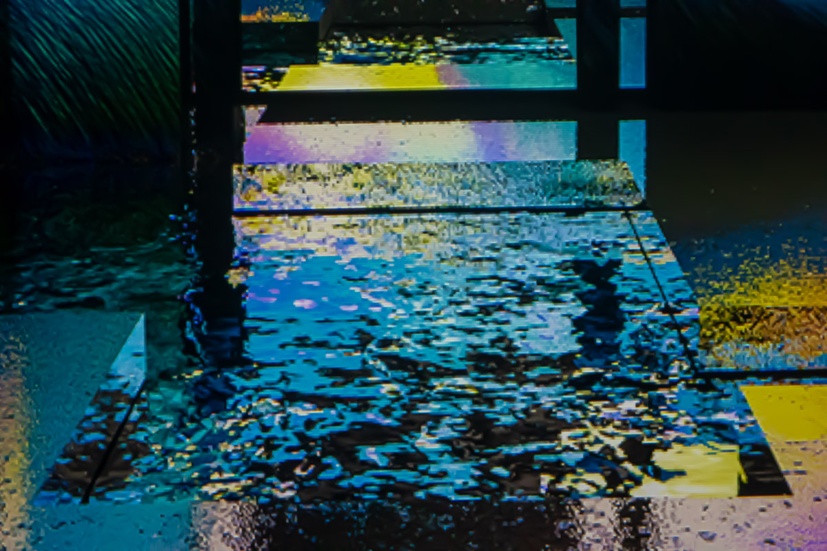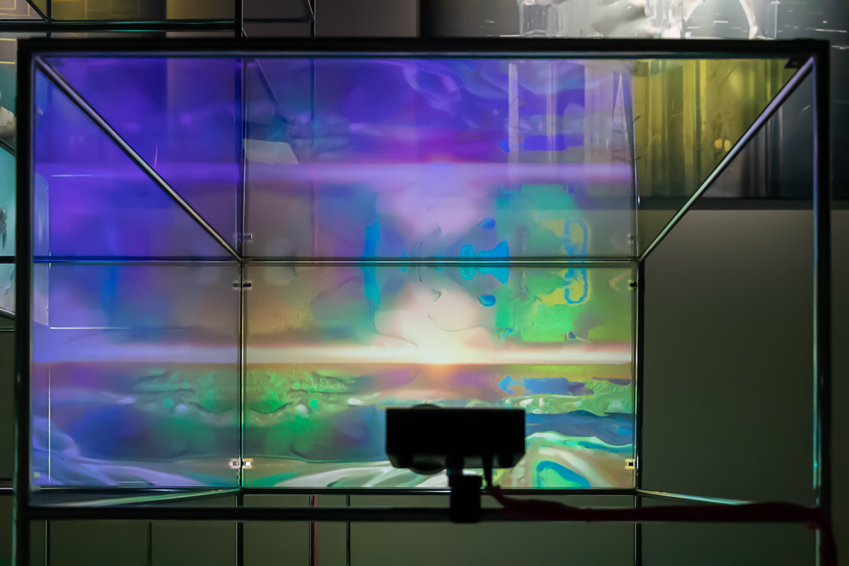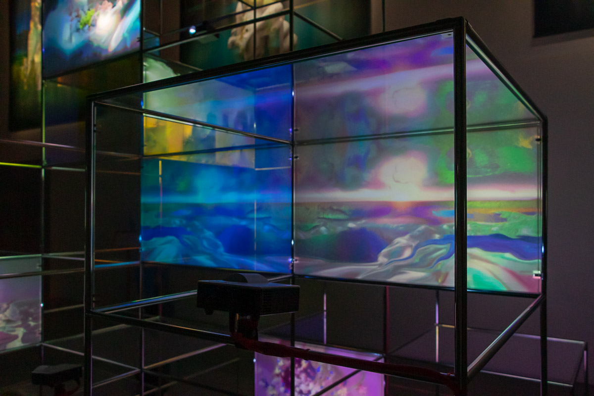 La première installation, Undream, se situe dans l’axe de l’entrée. Sur un écran 16/9 vertical, un ciel de crépuscule ondule. Il nous plonge immédiatement dans Aurae.