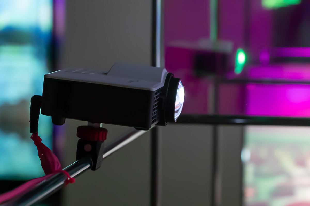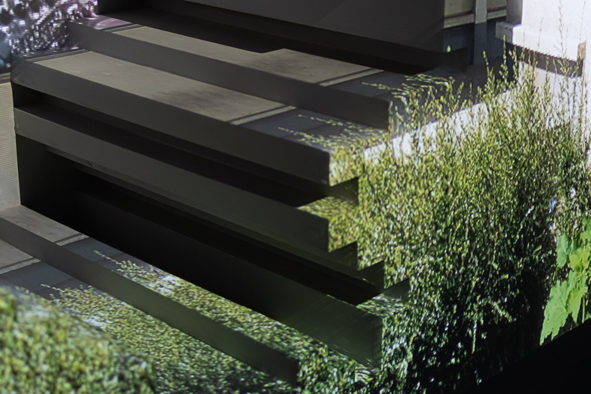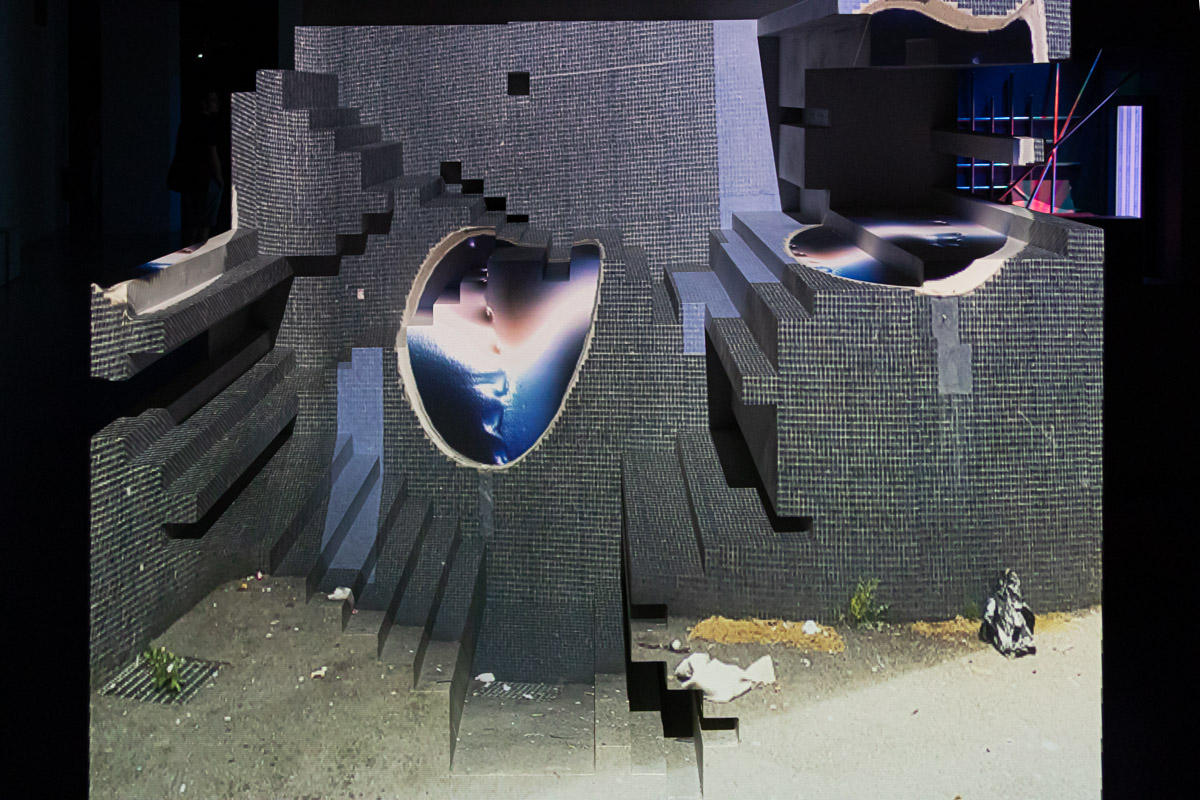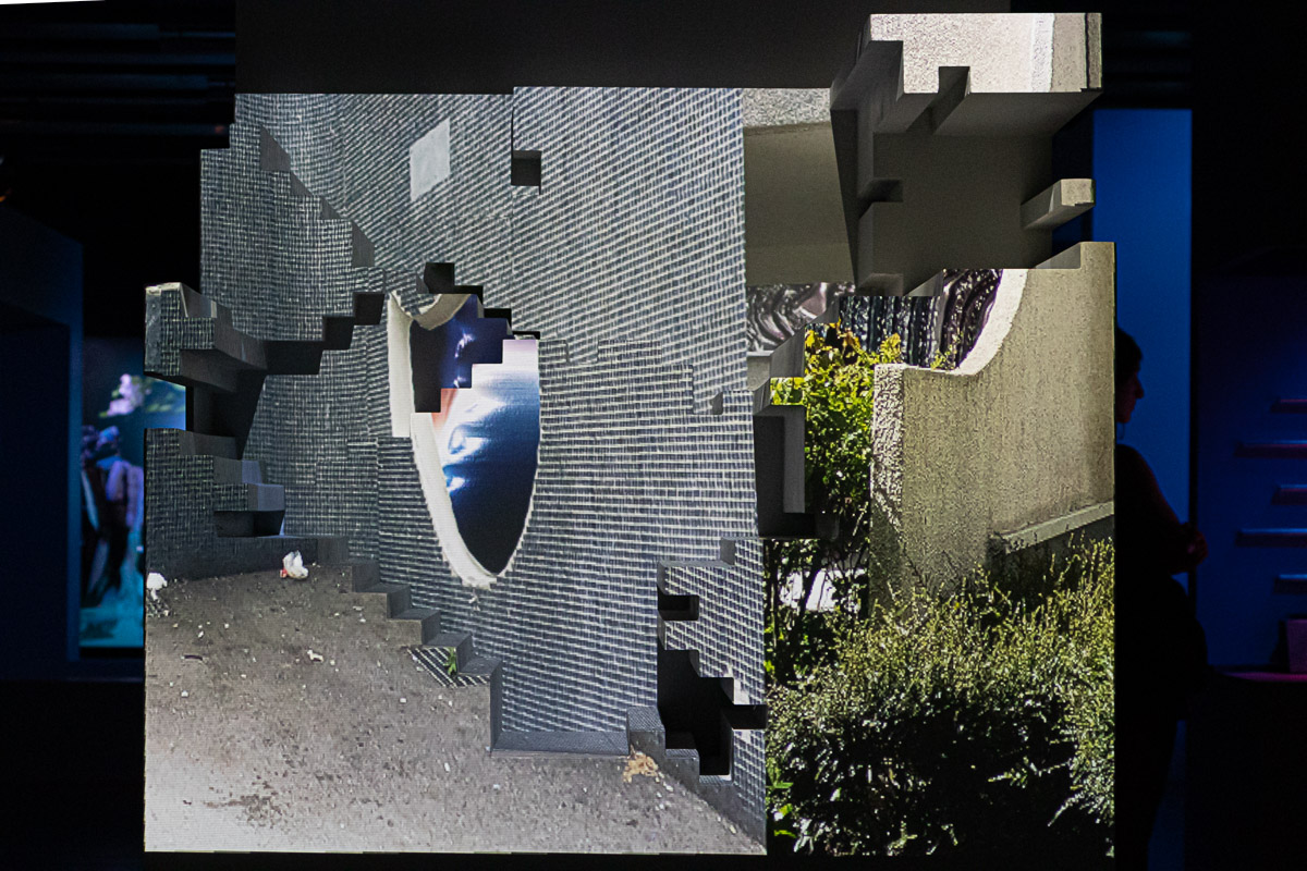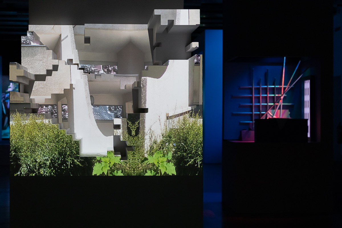 Entre deux poteaux de l’espace d’exposition, Machine for living prend place. L’artiste créée une scénographie hybride, entre volume réel et images en mouvement.