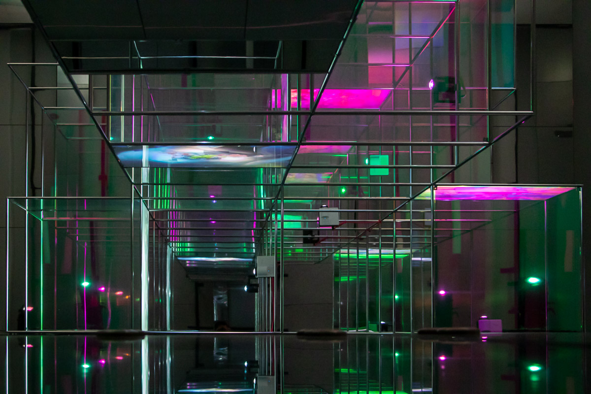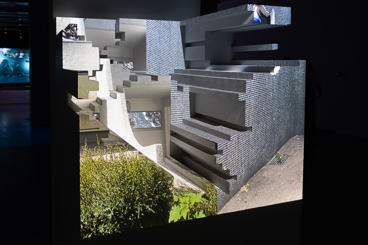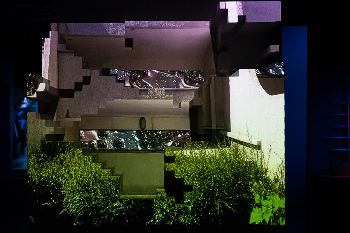 Sur une création sonore monocorde de Roger Tellier-Craig, l’interface se produit sur le volume 3D. Une hybridation résumée des « machines à habiter » d’après l’artiste, selon la formule de Le Corbusier.