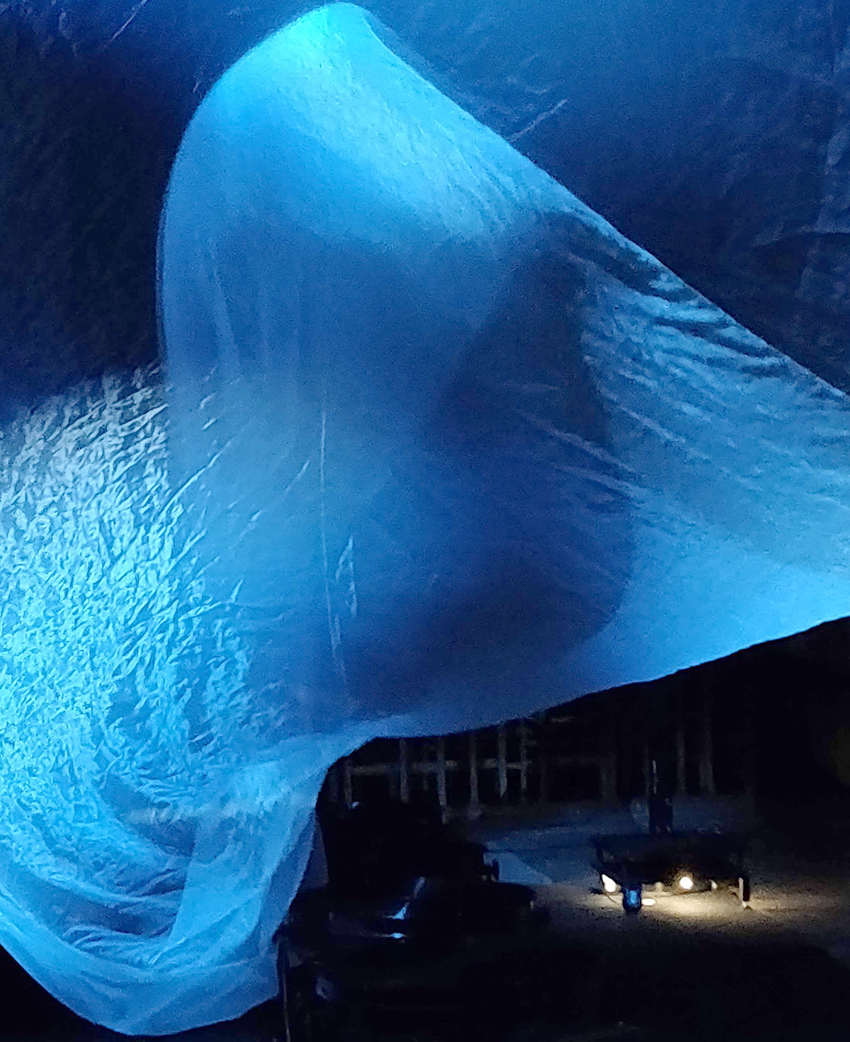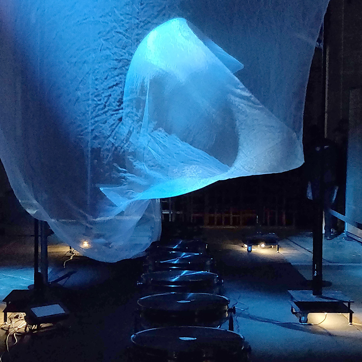 Deux voiles géantes de 6 mètres s’animent de part et d’autre du dôme avec des ventilateurs commandés. Selon les séquences du spectacle, elles accentuent l’ambiance maritime avant que n’arrive un orage imaginaire.