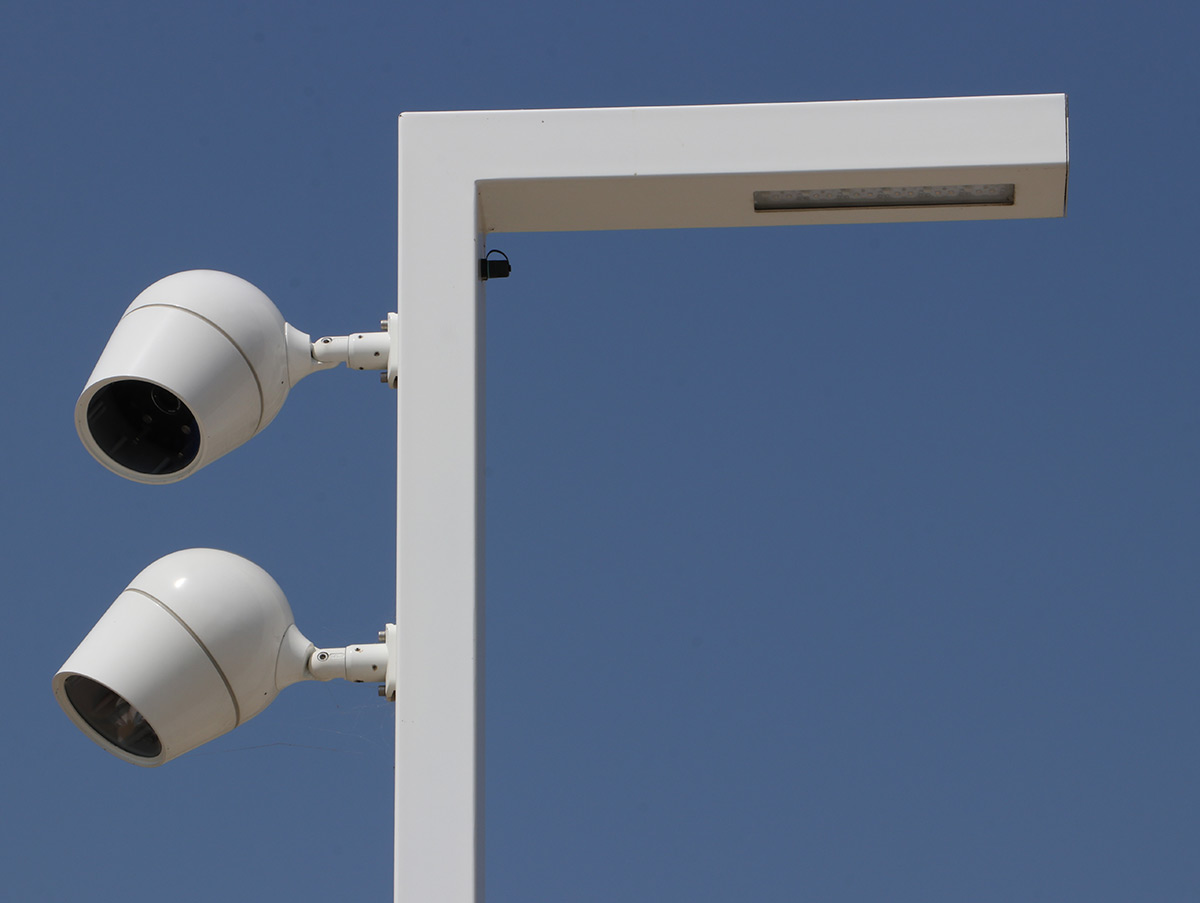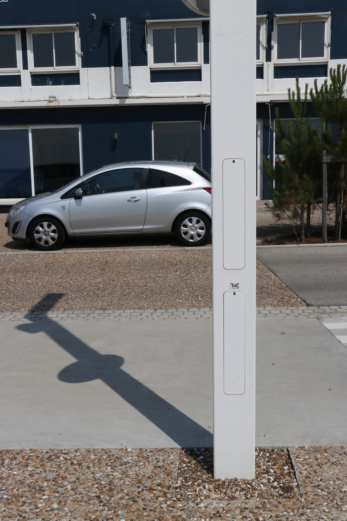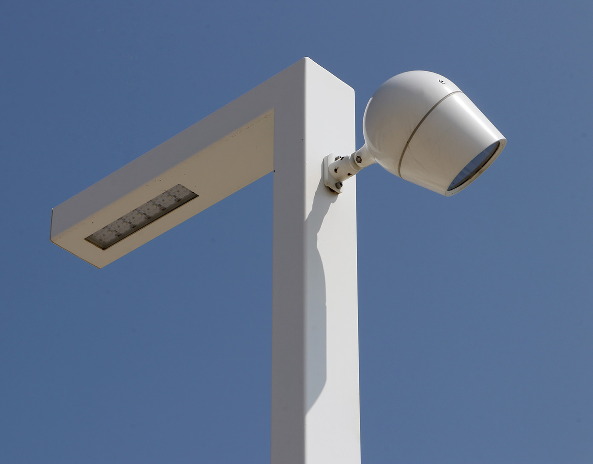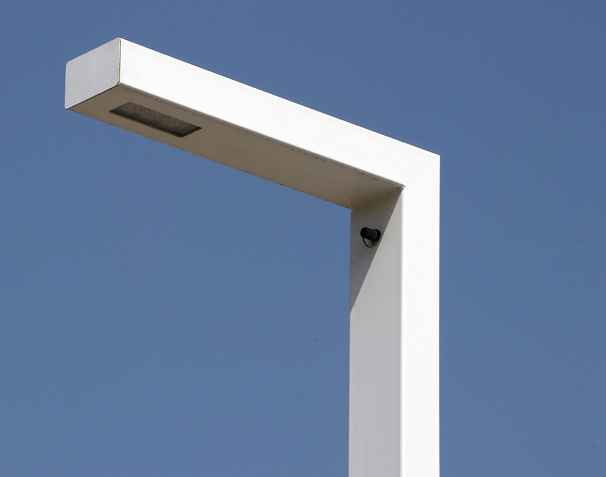 Portée par un mobilier élégant de TMC Innovation à l’échelle urbain de 6 mètres de haut, les mâts Evi laqué blanc sont réalisés en acier profilé.