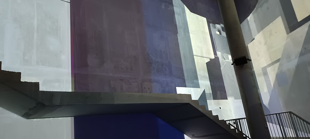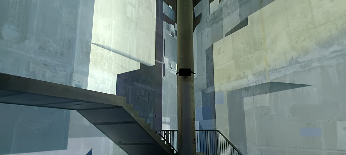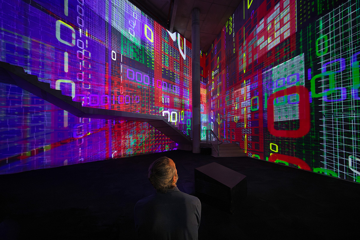 Une œuvre vidéo monumentale immersive dans l’espace du lieu. Elle plonge le spectateur dans un voyage infini à travers l’architecture complexe du cyberespace, d’une ville virtuelle, rendant perceptibles les flux, les réseaux filaires et les échanges de données qui y circulent. Ainsi, les réseaux s’entrelacent et se superposent, créant des effets cinétiques hypnotiques.
