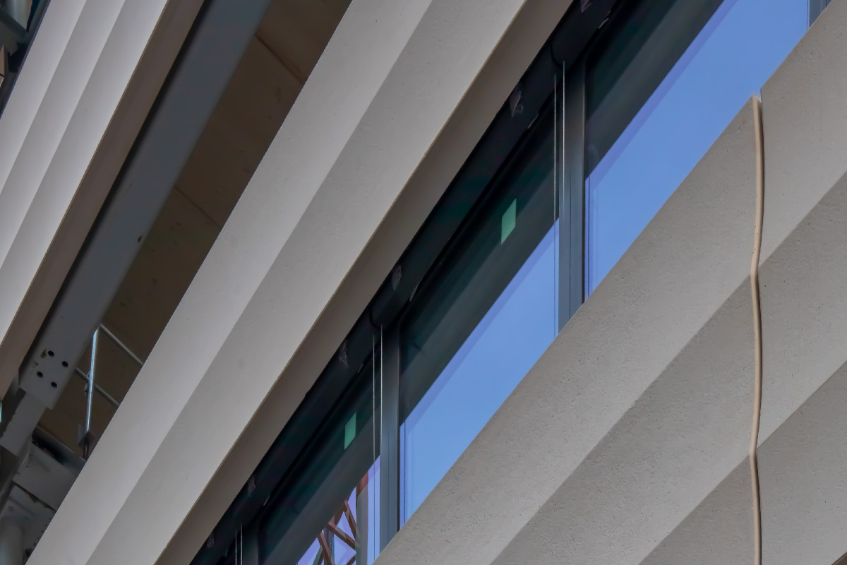 « Les façades sont travaillées selon un principe en bandeau, d’une teinte claire, légèrement ocre, et texturé, alternant minéral et vitrage aux hauteurs différentes ».