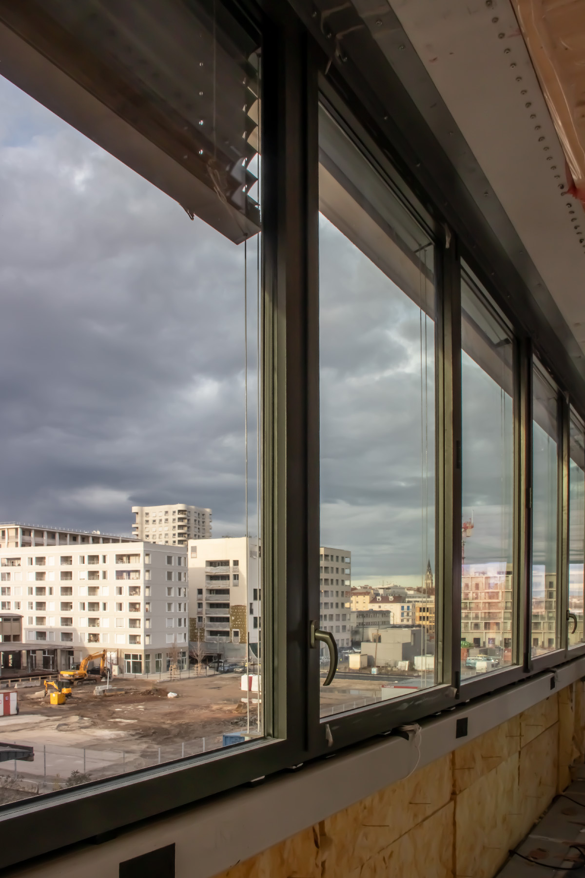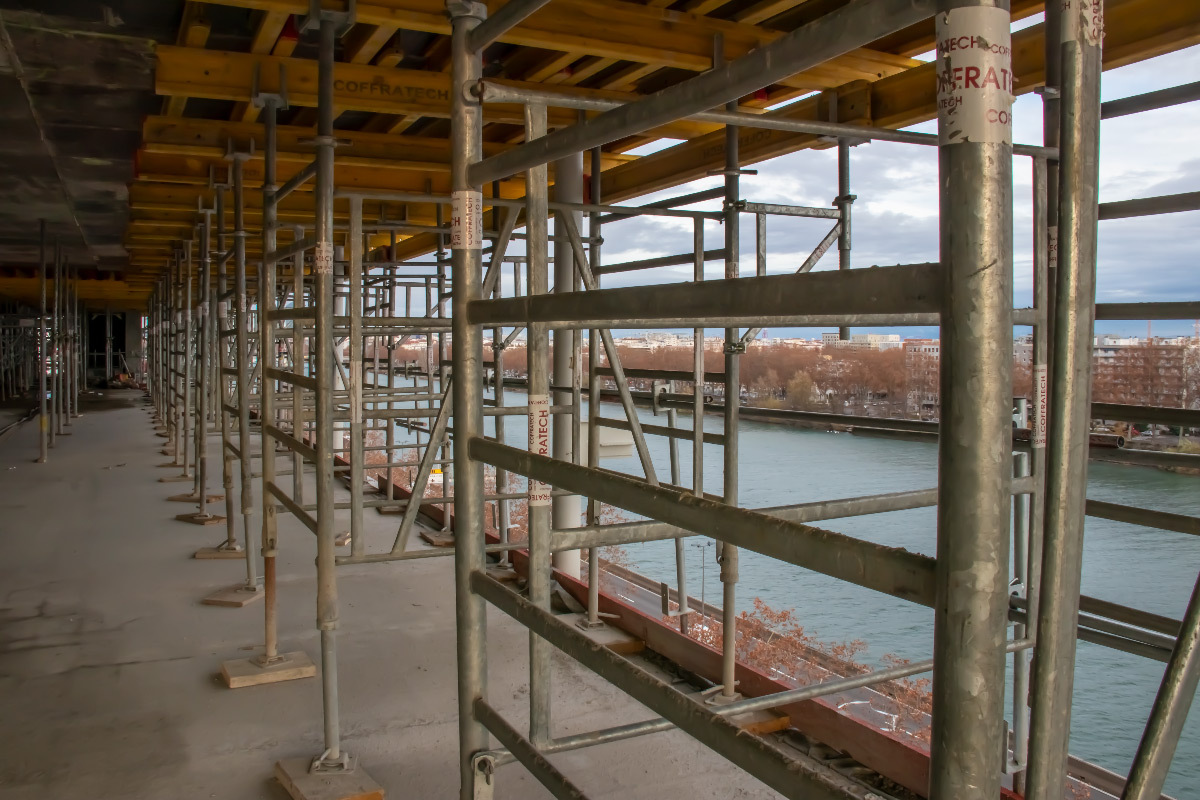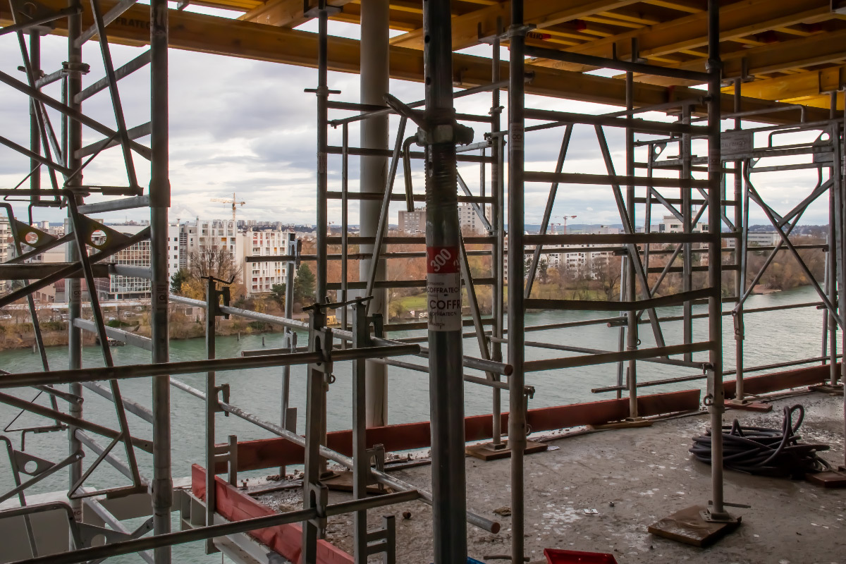 Au cœur du quartier de Lyon Confluence, proche de l’hôtel de Région Auvergne-Rhône-Alpes, il longe le quai de Perrache le long du Rhône. Visite du chantier en fin de gros-œuvre le 11 décembre 2020.