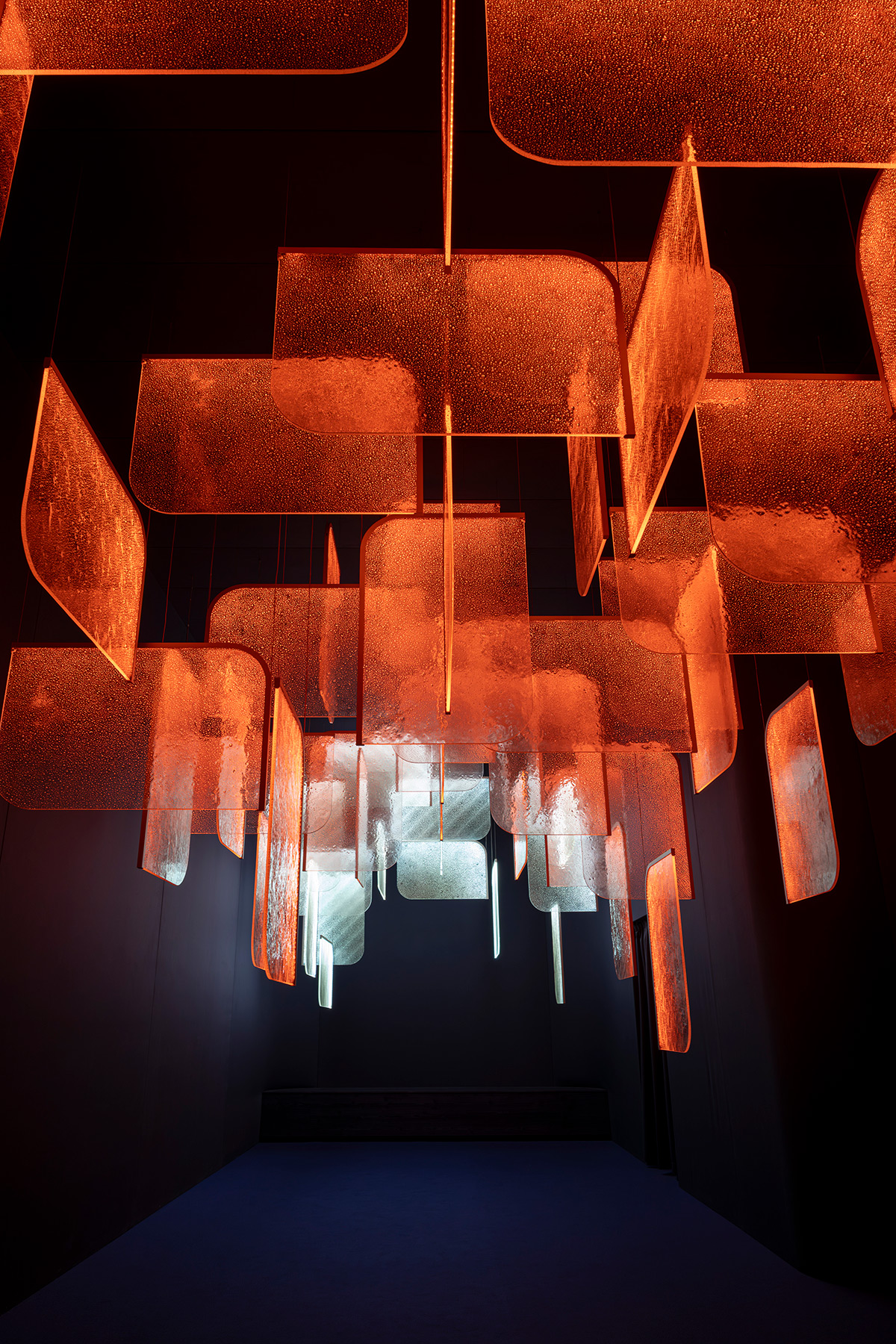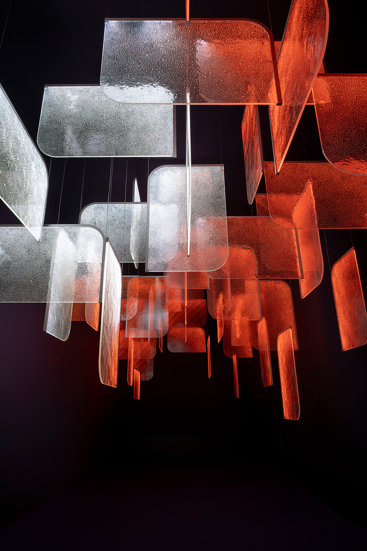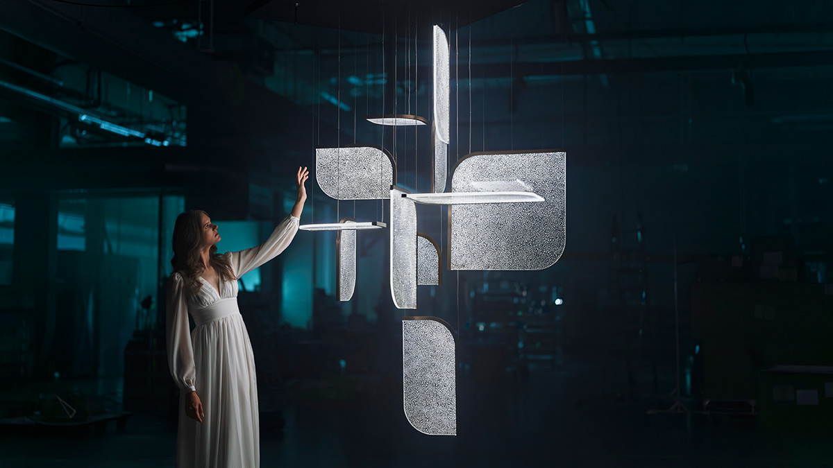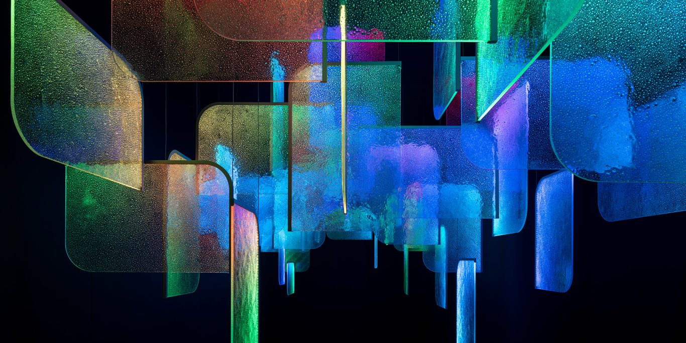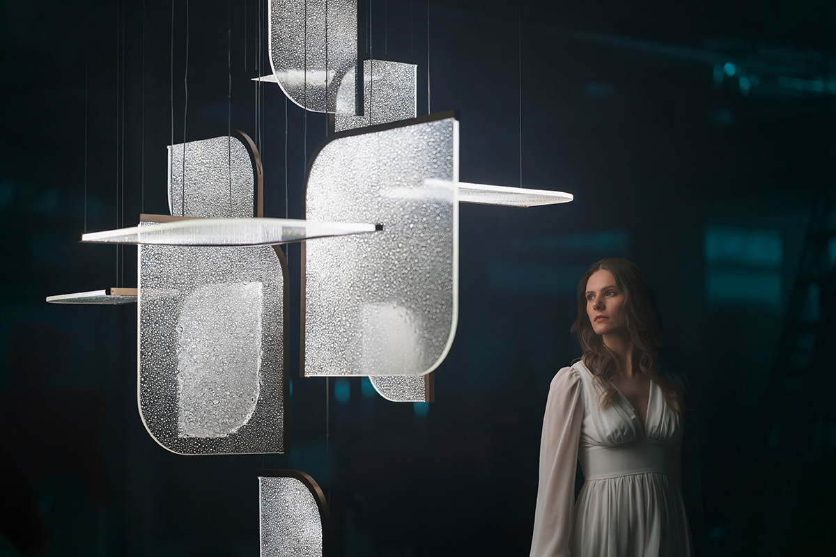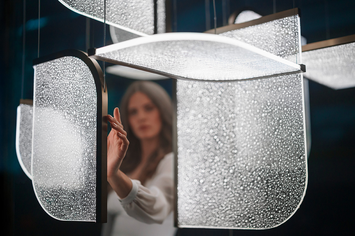 Grâce à un effet lumineux 3D exclusif, la lumière se diffuse d’un panneau à l’autre. Elle révèle les bulles d’air intégrées dans le verre, ce qui donne à l’ensemble une qualité presque liquide.