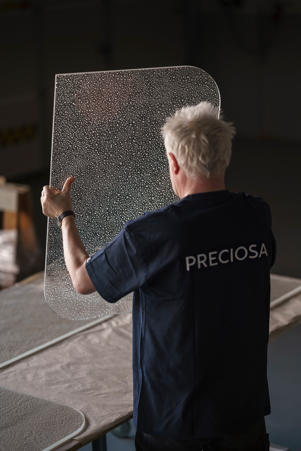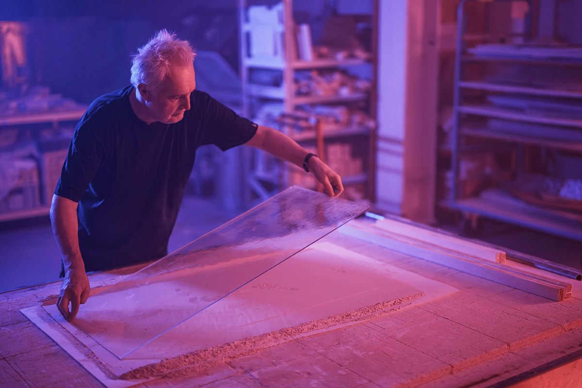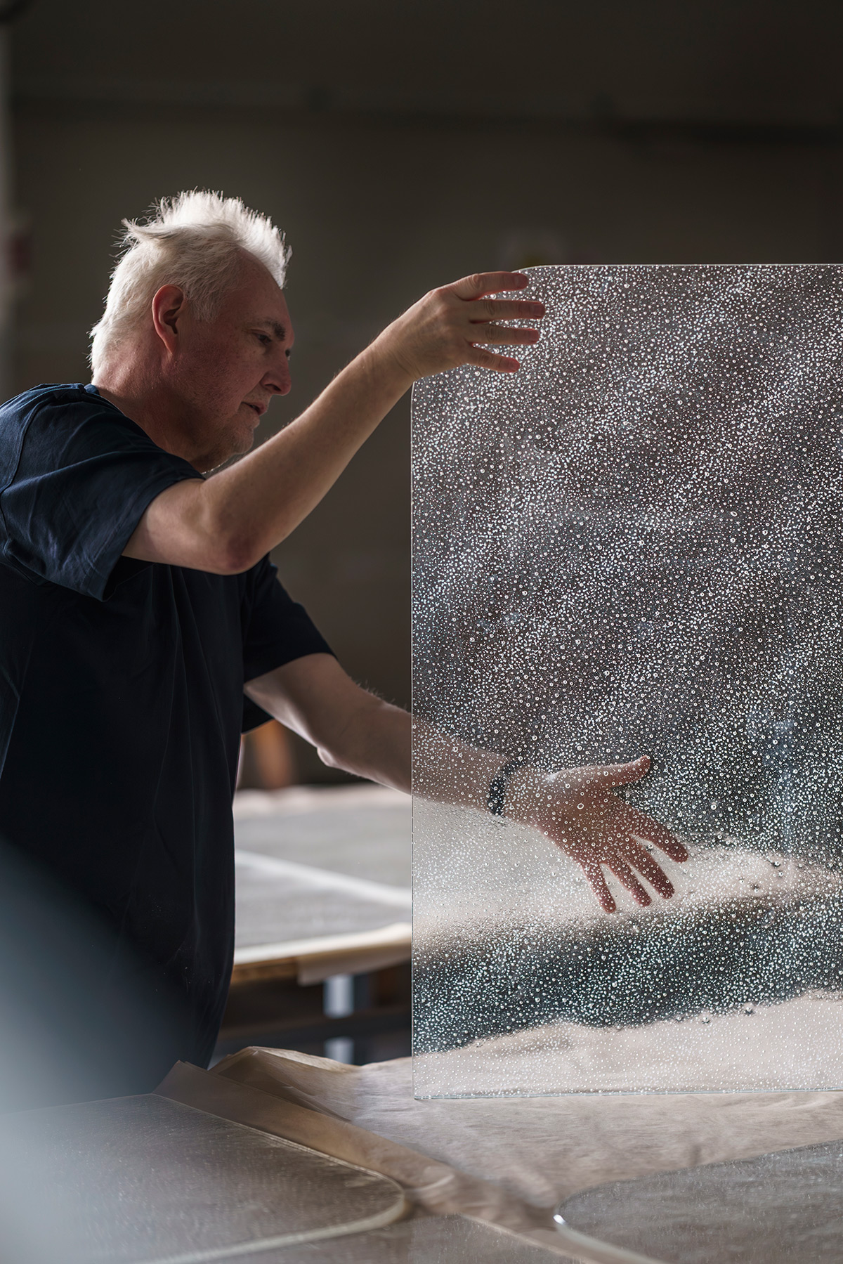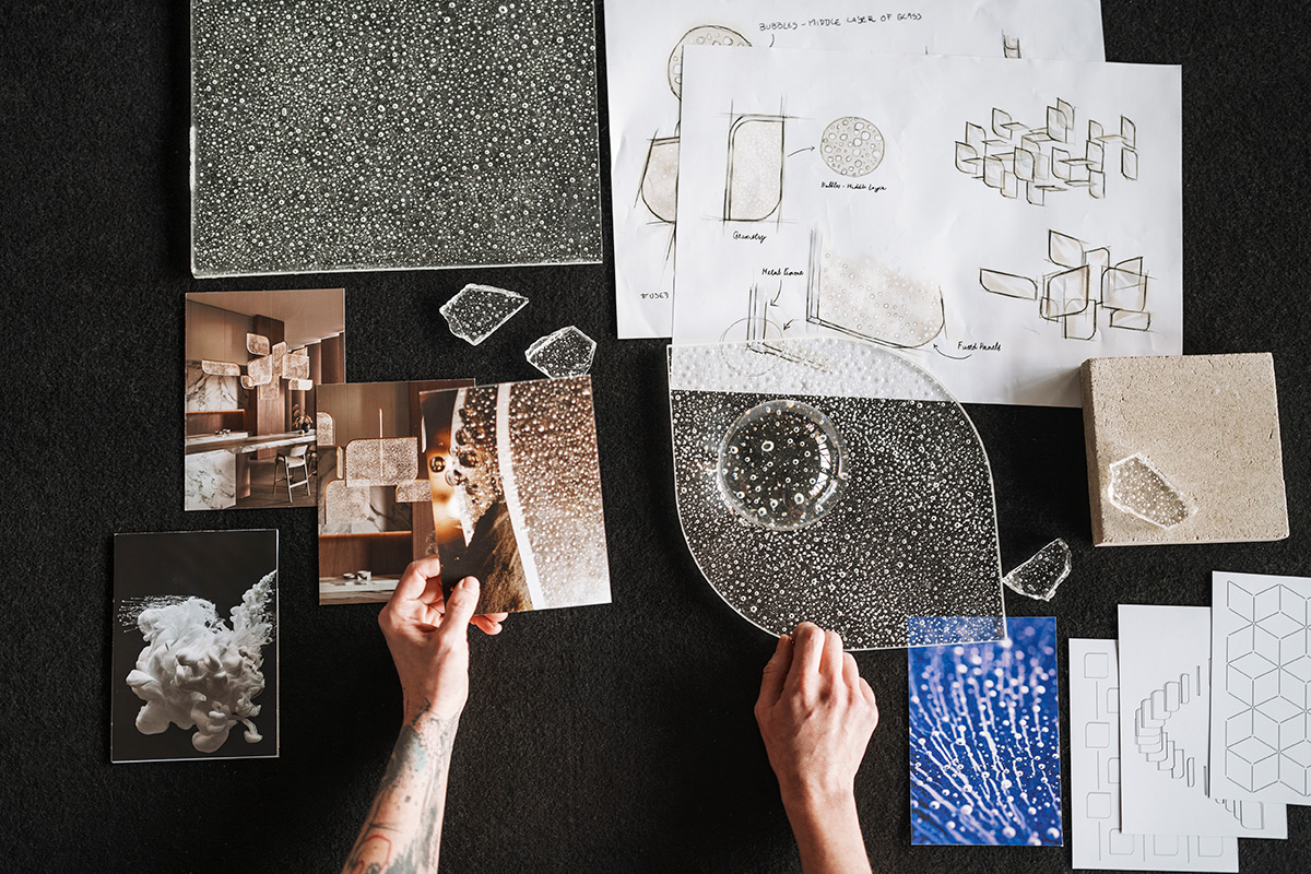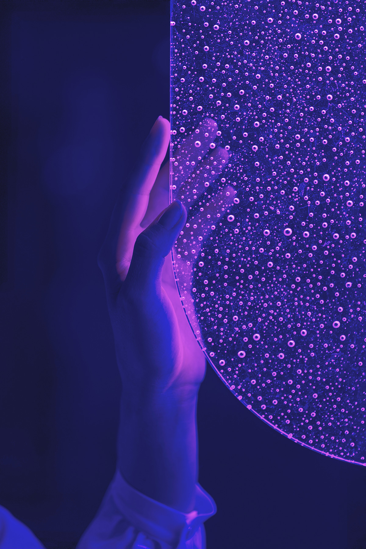 Grâce à un effet lumineux 3D exclusif, la lumière se diffuse d’un panneau à l’autre. Elle révèle les bulles d’air intégrées dans le verre, ce qui donne à l’ensemble une qualité presque liquide.