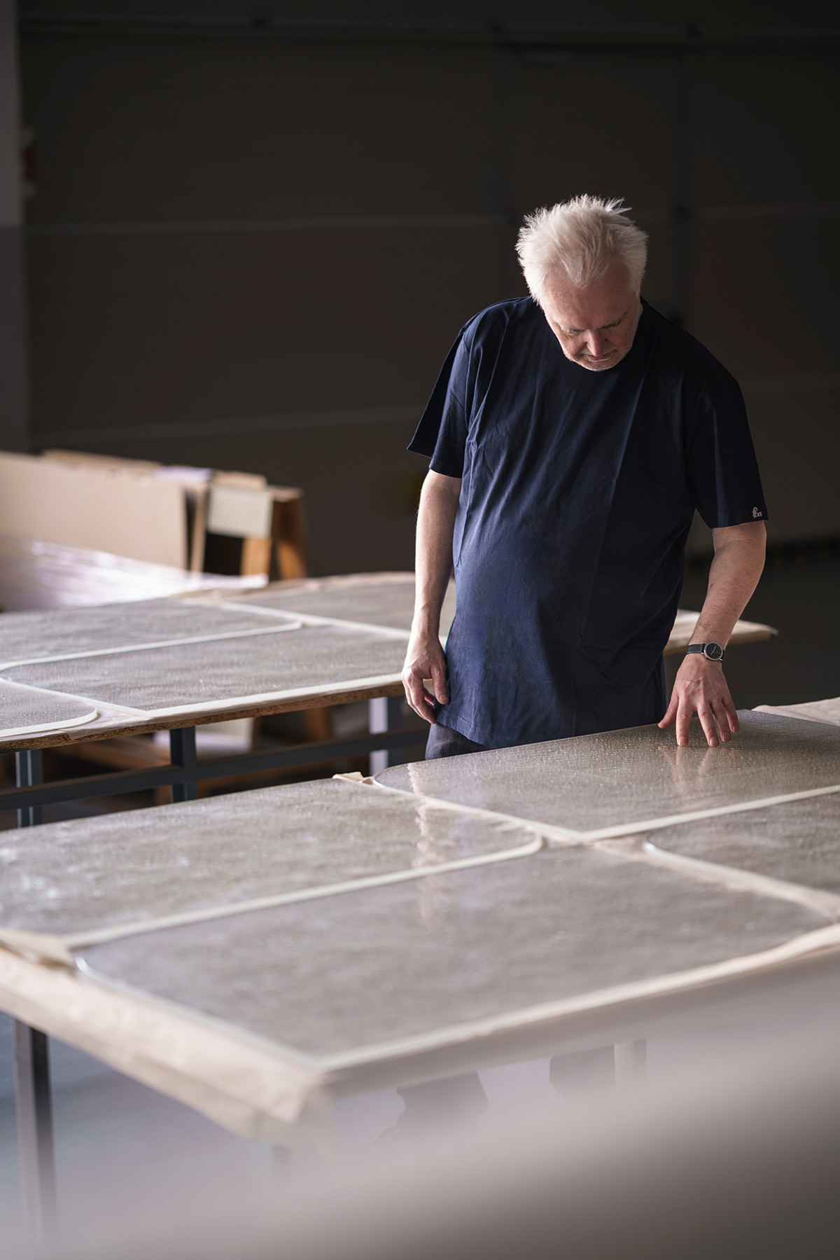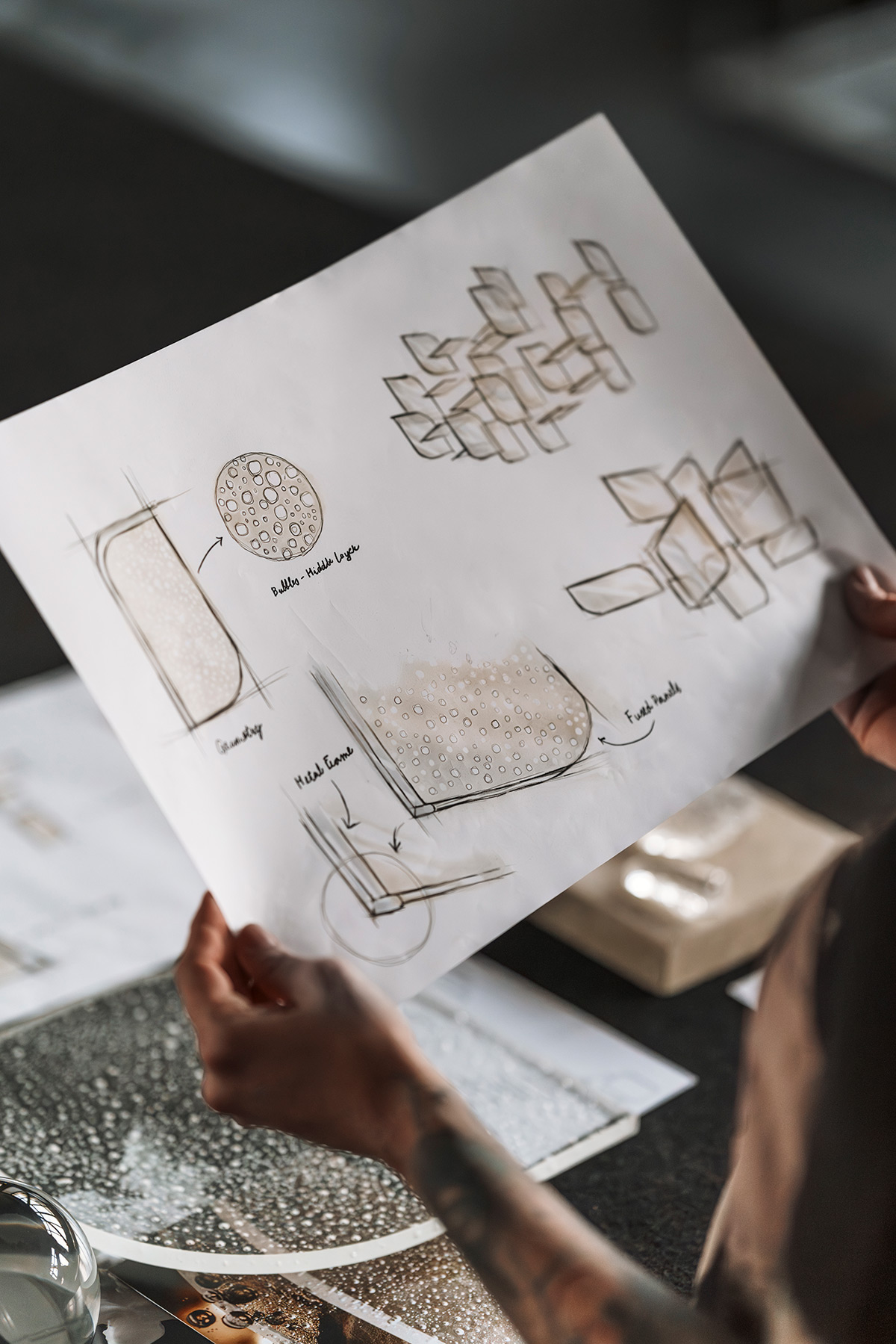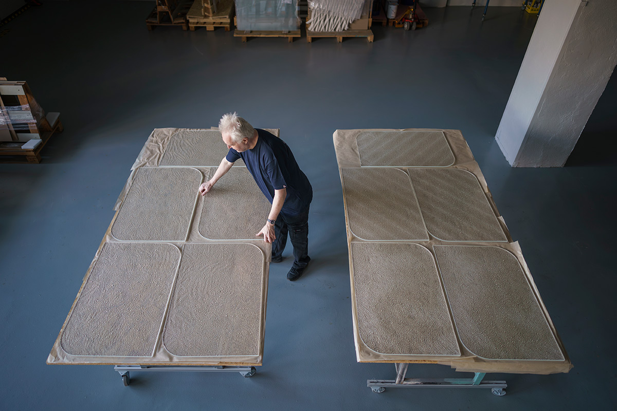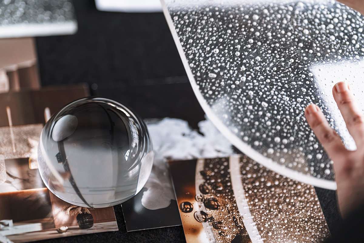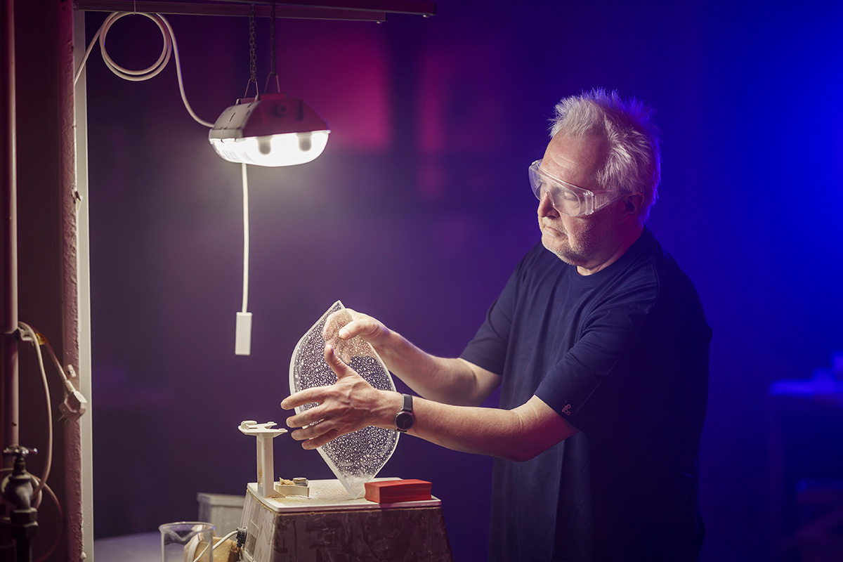 Grâce à un effet lumineux 3D exclusif, la lumière se diffuse d’un panneau à l’autre. Elle révèle les bulles d’air intégrées dans le verre, ce qui donne à l’ensemble une qualité presque liquide.