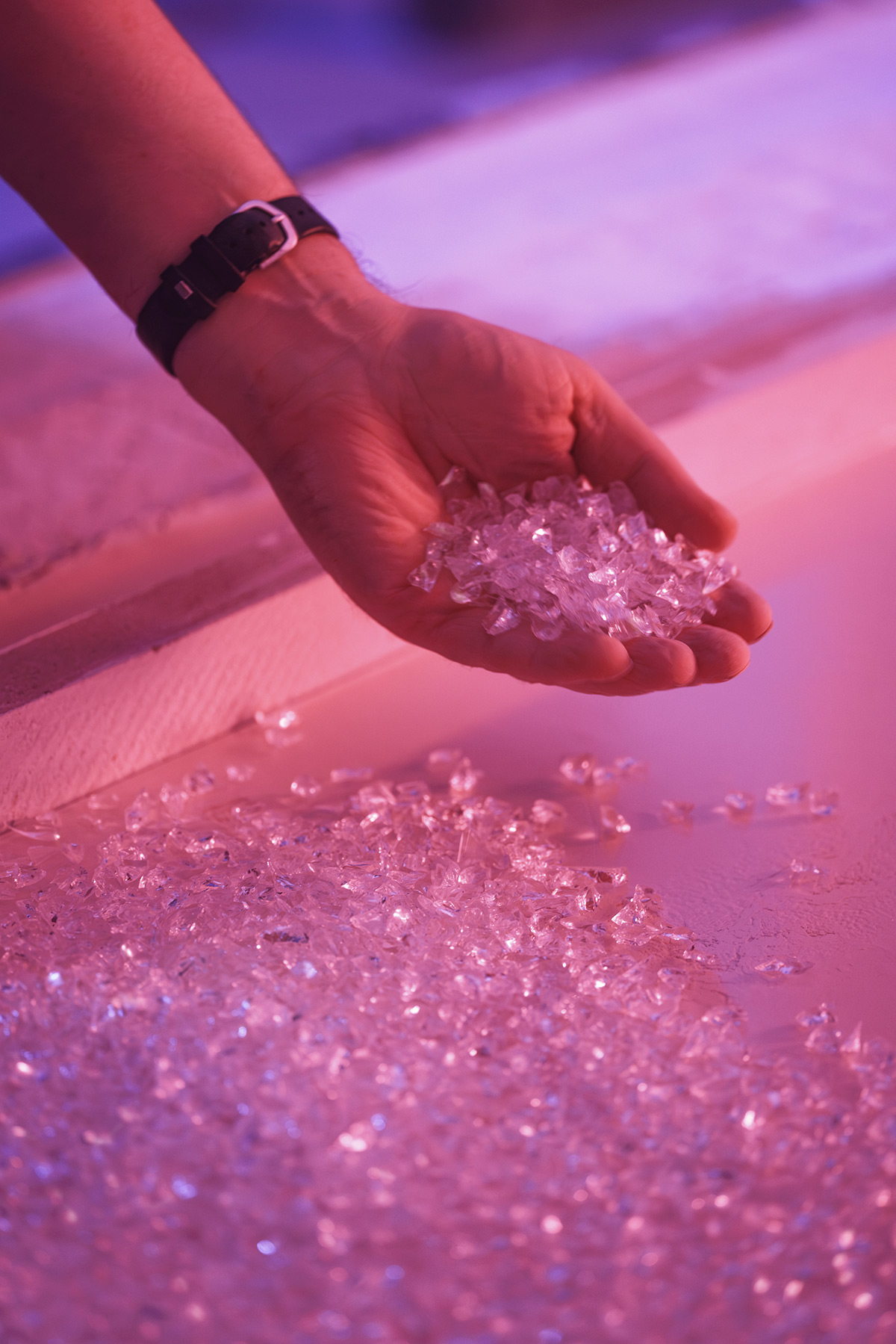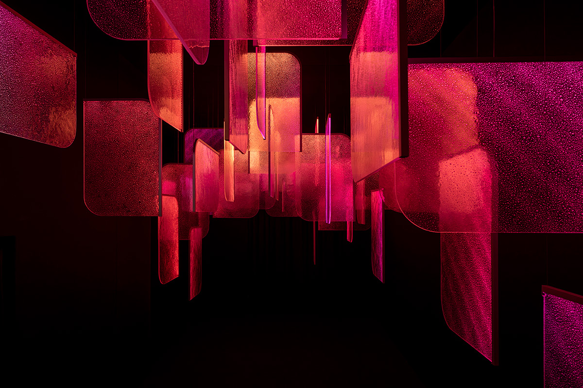 Les panneaux de verre sont fixés avec un système discret de châssis métalliques, ce qui permet à la lumière d’être l’actrice principale du lieu. Entre art contemporain et design expérientiel, cette scénographie enveloppante transforme la galerie en paysage lumineux.