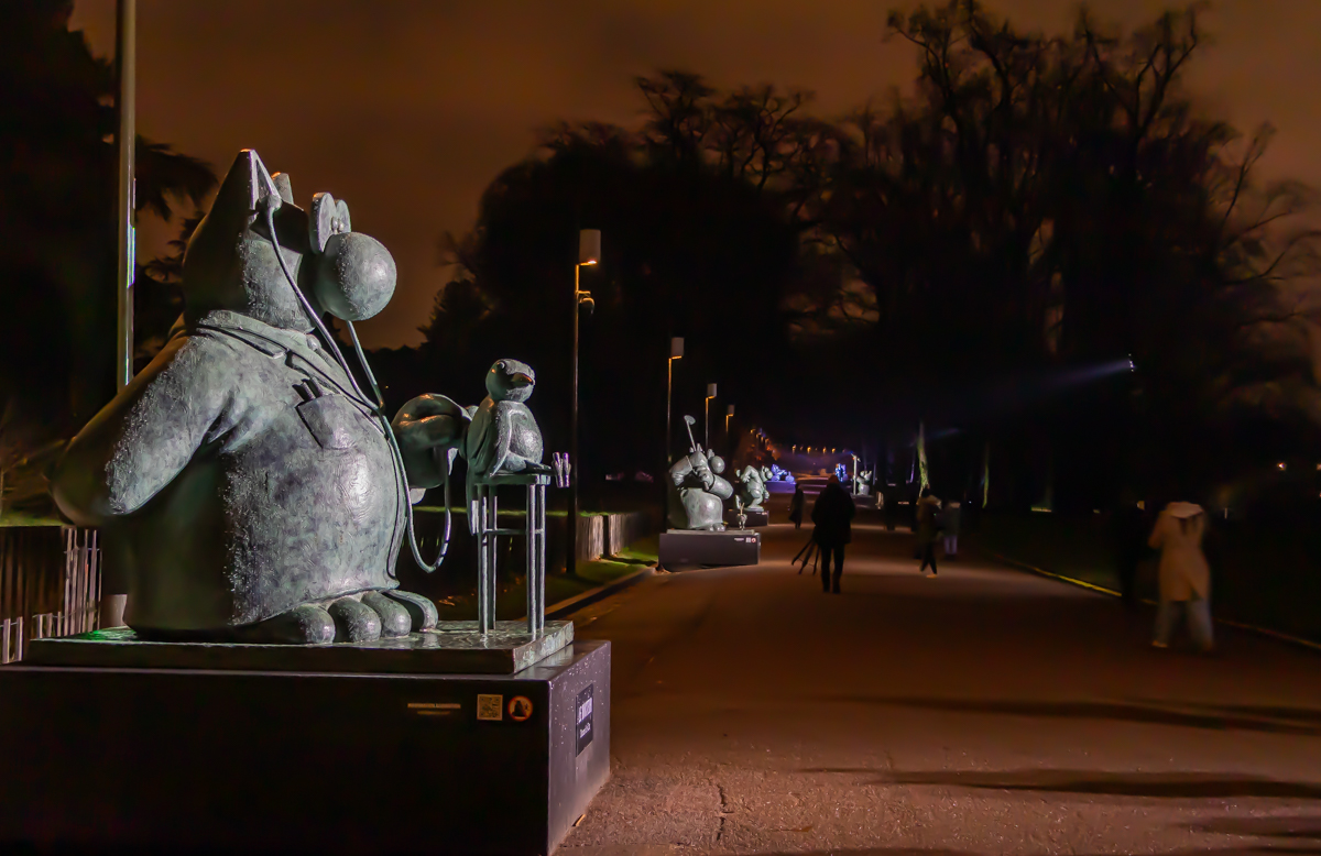 Après le spectacle de drones, l’allée vers la sortie, vous déambulerez le long des statues d el’œuvre sculptée représentant Le Chat de Geluck, drôles et tendres silhouettes éclairées. Ils prennent possession du parc en contrepoint du ballet aérien.