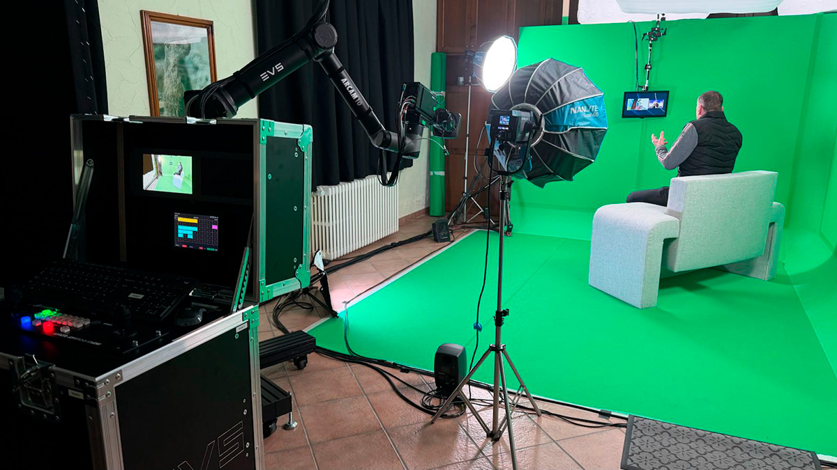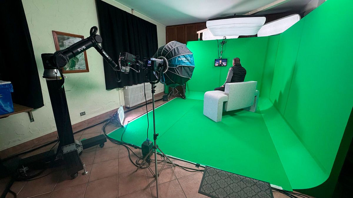 Pour obtenir un éclairage homogène sur du fond vert, Frédéric Redondo explique que l’équipe a choisi d’utiliser le Radi-44 Pro Air de chez Aparo. Ce dispositif innovant se présente sous la forme d’un matelas pneumatique gonflable fixé au plafond. Mesurant 1,5 x 1,5 mètre, et d’une épaisseur d’environ 15 centimètres, il est éclairé en LED de l’intérieur en RGB. Comme un ciel nuageux, sa luminosité est optimale pour un éclairage d’ambiance omnidirectionnel.