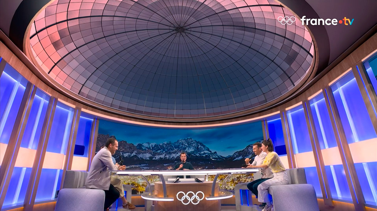 Le plateau immersif de Milan est un joyau technologique. Il ne compte pas moins de huit caméras, soigneusement placées pour capturer tous les angles des consultants sportifs. L’éclairage combine face et contre-jour sur les présentateurs. « Nous utilisons uniquement des LED. Toutes les machines sont en trichromie ou blanc variable, variant entre 3 000 K et 7 000 K », détaille Christian Khalfa, chef d’équipe pupitreur chez France Télévisions. « Nous avons des teintes dans le décor plus chaudes le matin, et froides le soir. »