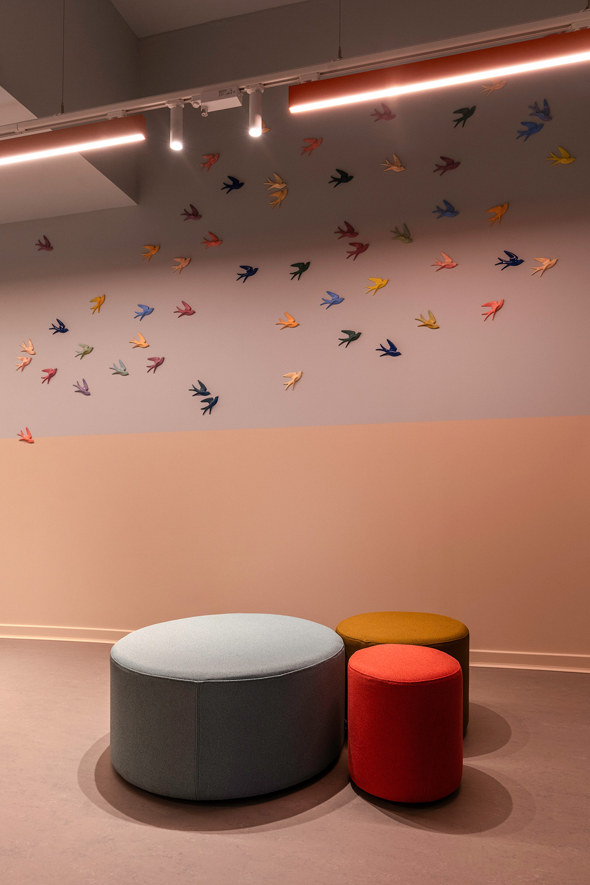 Dans ce lieu de soutien psychologique, la lumière joue un rôle thérapeutique. Elle structure les zones, sécurise les cheminements et guide sans effort les visiteurs. Les contrastes doux invitent au relâchement. Les couleurs contribuent à recréer une atmosphère domestique, presque familière.