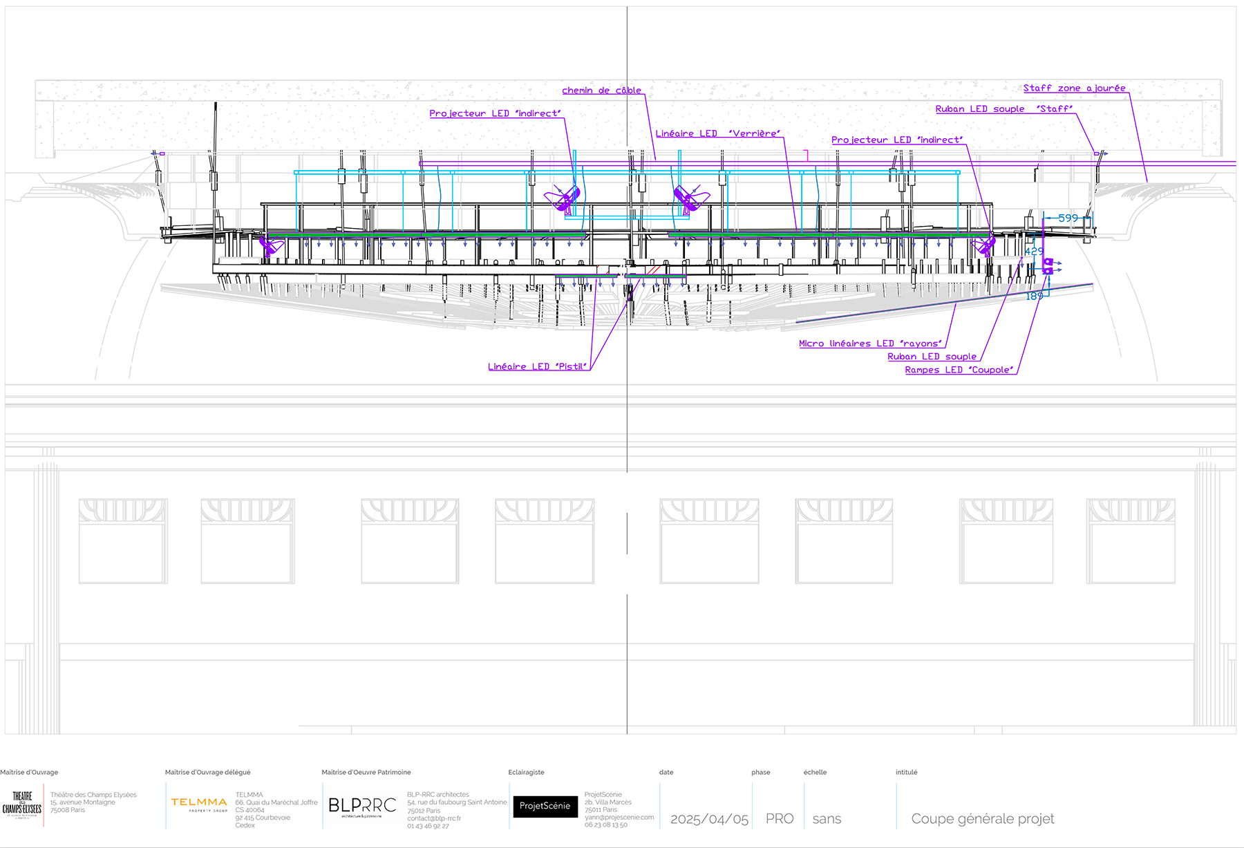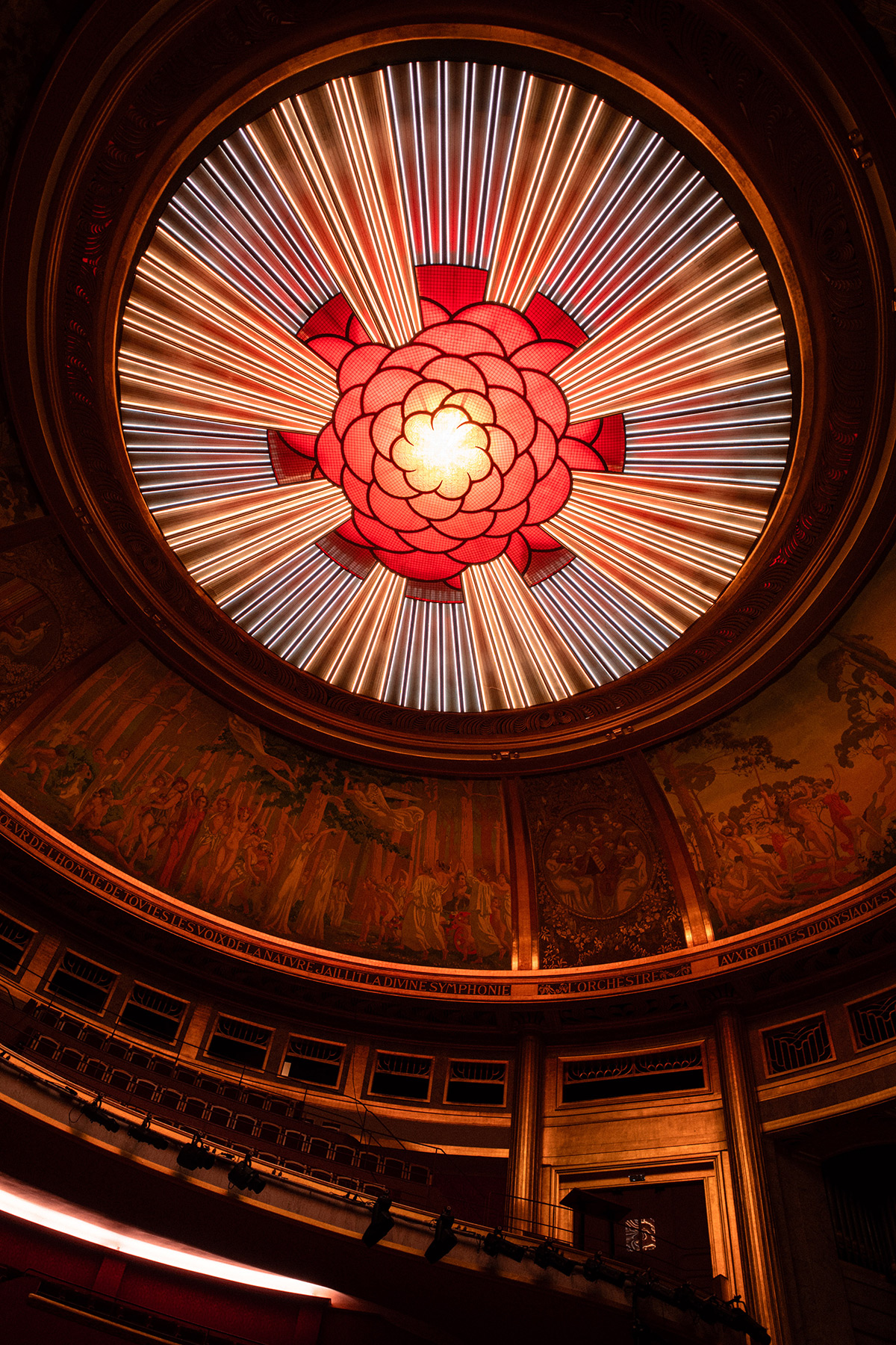 Alors, pour la maîtrise d’ouvrage déléguée à Pierre Solignac, TELMMA, le cadre était simple : assurer la sécurité, fiabiliser l’éclairage, mais aussi redonner vie à ce lieu mythique. En effet, cette salle de spectacle est fréquemment louée pour des défilés, la Fashion Week, et des captations scéniques pour la télévision. « L’éclairage doit promulguer des niveaux réglementaires pour l’accessibilité, valoriser et préserver les peintures de Maurice Denis, pouvoir générer des effets événementiels sans recours à du matériel tiers et être peu énergivore », résume l’éclairagiste.