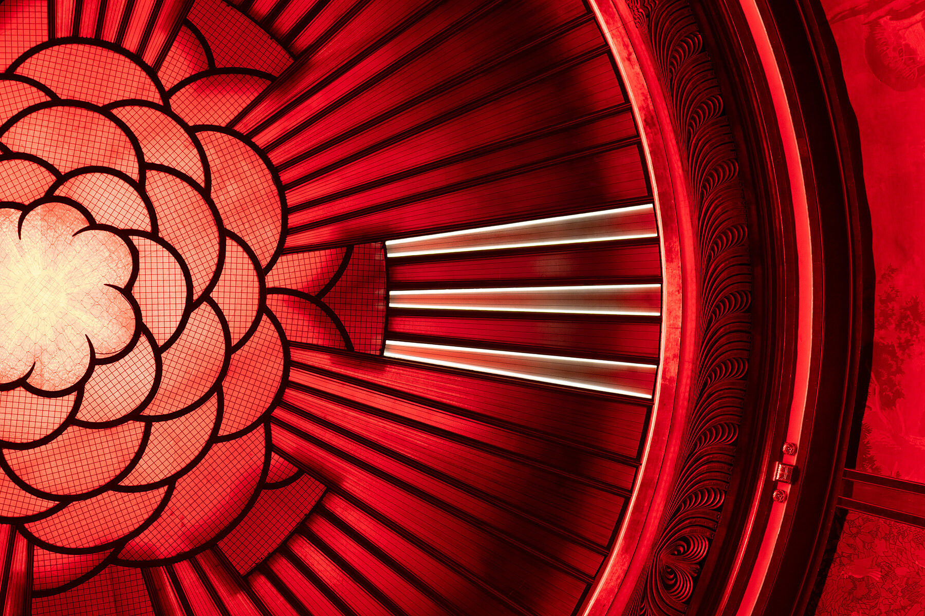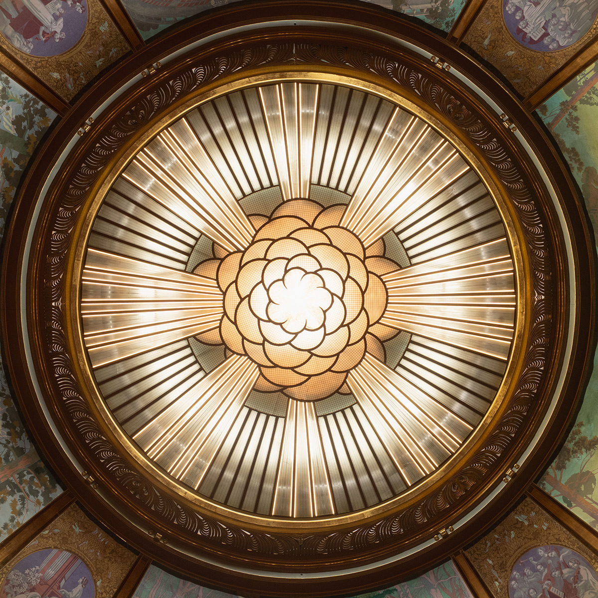 Afin de prolonger l’écriture architecturale, les sources lumineuses ont été positionnées en cohérence avec le motif floral central. Ce travail minutieux intègre à la fois la lumière diffuse sous la verrière, l’éclairage direct des peintures périphériques, et des effets graphiques innovants, comme les 160 « rayons de lumière », explique-t-il. Marquant la coupole d’une aura inédite, ils sont délicatement dissimulés dans les profilés du verre.