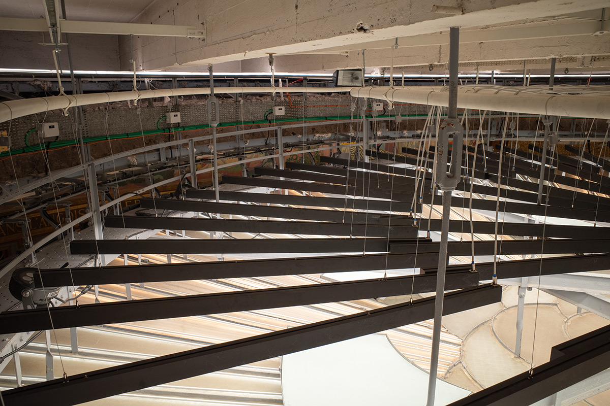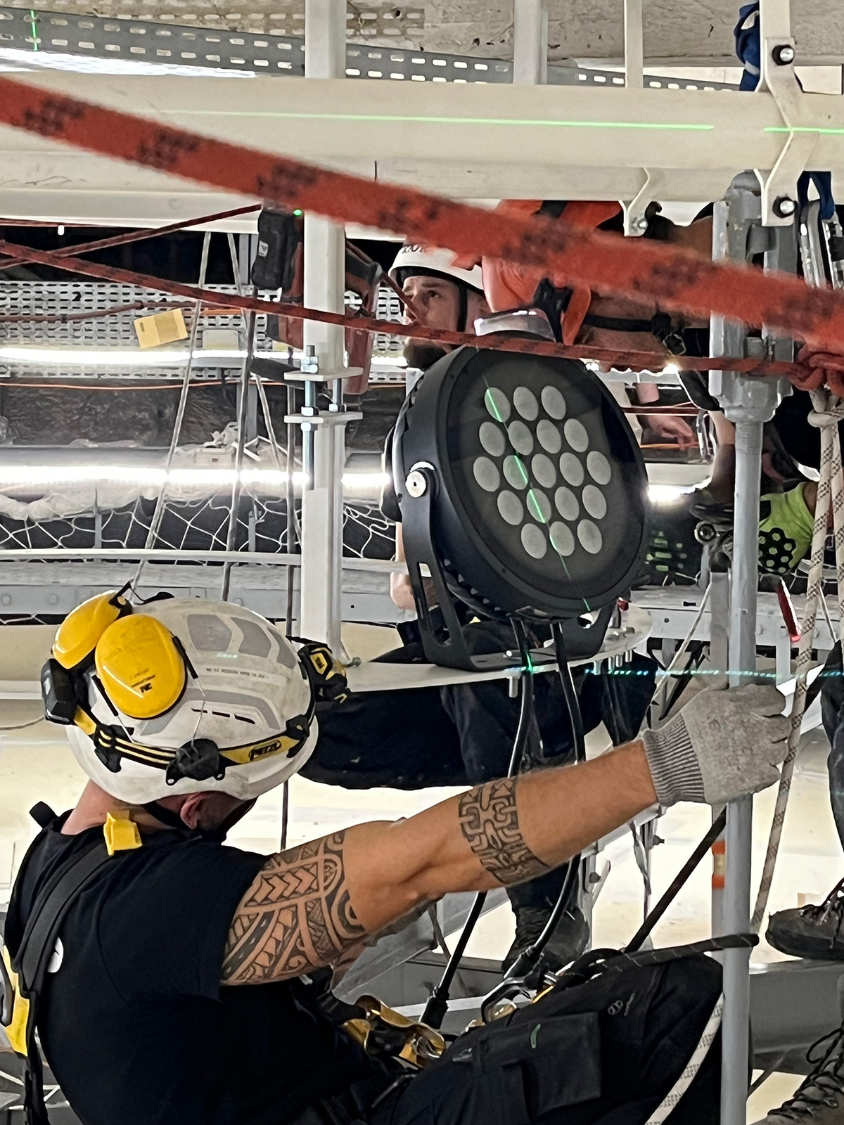 « Tous nos techniciens sur ce projet sont allés faire une formation cordiste pour prendre en compte les enjeux de travailler à 25 mètres de haut. Le but n’était pas de devenir cordiste, mais de prendre conscience que quand on prend un marteau, il ne faut surtout pas le faire tomber sur la verrière du début du siècle, classée monument historique. Sinon, ça va être un drame ! ». Rendue complexe par la hauteur et par le caractère classé du bâtiment, l’installation a néanmoins nécessité la mobilisation des cordistes de la société Colibri.