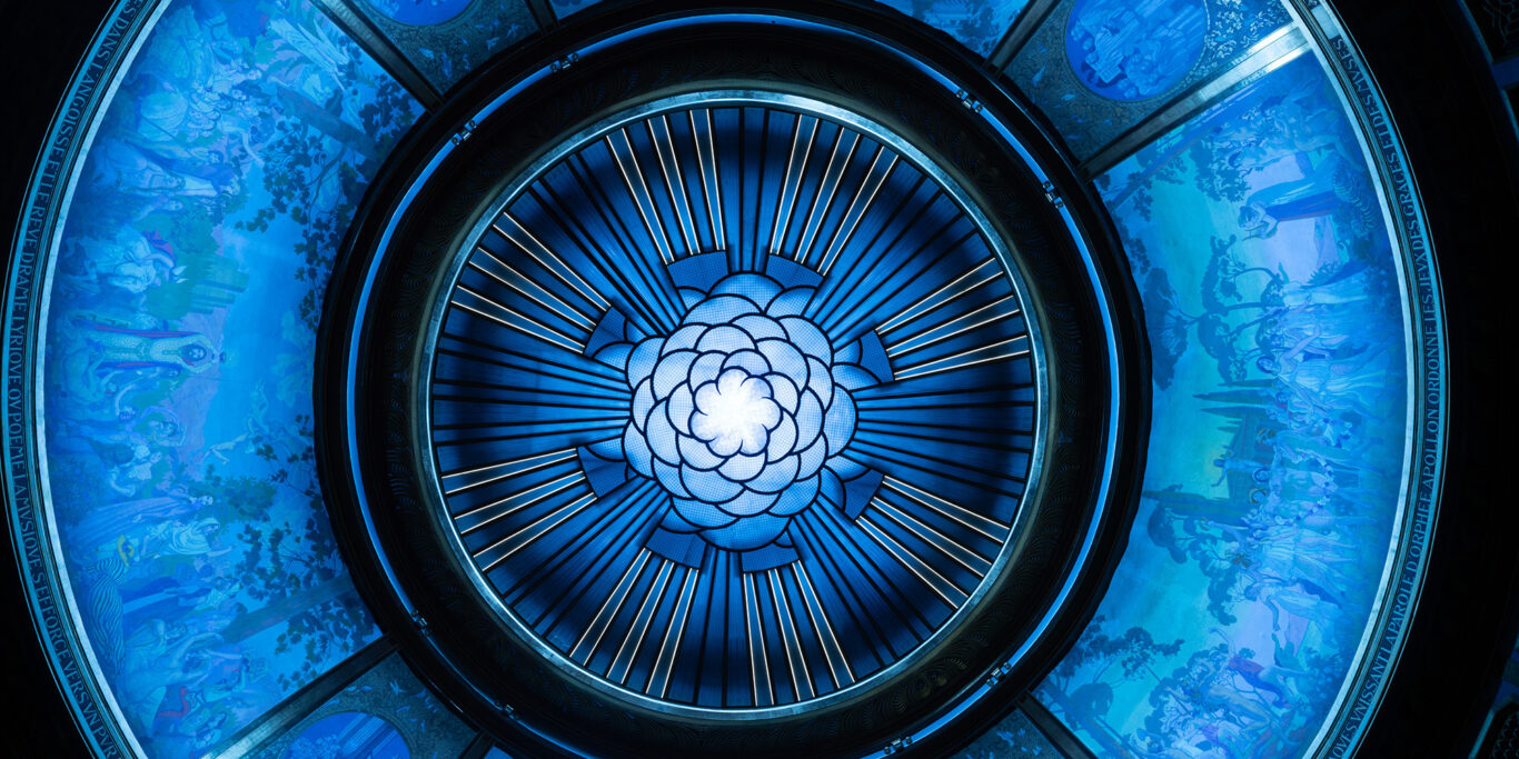 Afin de prolonger l’écriture architecturale, les sources lumineuses ont été positionnées en cohérence avec le motif floral central. Ce travail minutieux intègre à la fois la lumière diffuse sous la verrière, l’éclairage direct des peintures périphériques, et des effets graphiques innovants, comme les 160 « rayons de lumière », explique-t-il. Marquant la coupole d’une aura inédite, ils sont délicatement dissimulés dans les profilés du verre.