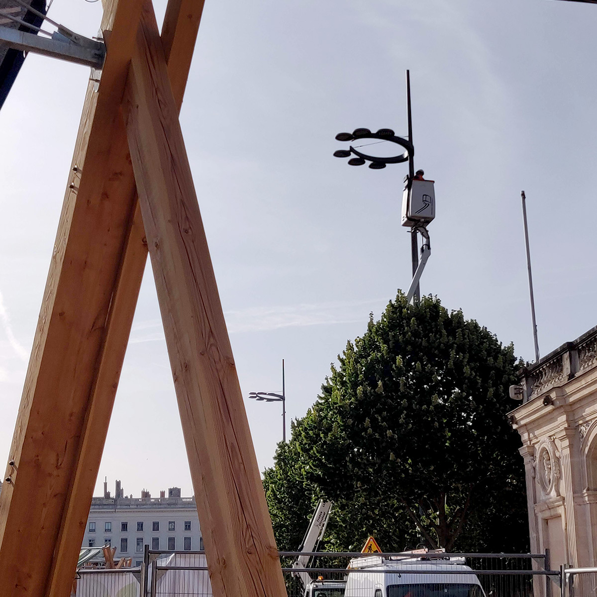 Ainsi, le choix s’est porté sur les mâts existants en périphérie de la place Bellecour. Des projecteurs à découpe sont alors implantés dessus à 9,5 mètres environ.