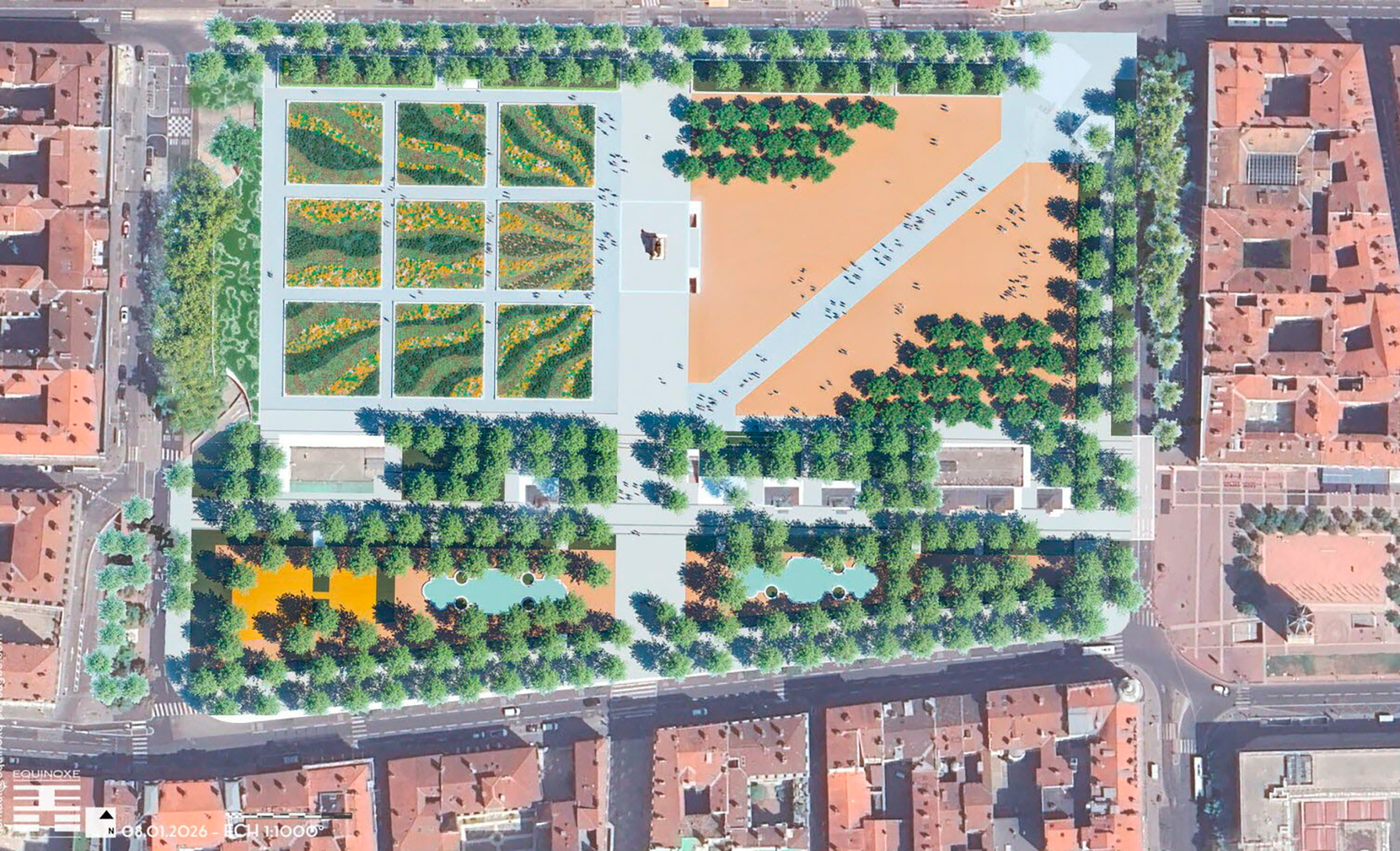 Deux vues d’ensemble du projet de végétalisation ont été conçues par le paysagiste, Patrick Renault, Equinoxe Paysages de Vaugneray, dans l’Ouest de Lyon. La première présente une vue aérienne de la place avec une recomposition des espaces publics. Son plan masse prévoit 4 000 m² plantés d’arbustes et plusieurs rangées d’arbres. La statue de Louis XIV et son parvis seraient rénovés, et l’œuvre « Tissage urbain » ne serait pas supprimée mais déplacée, dans le respect de l’artiste.