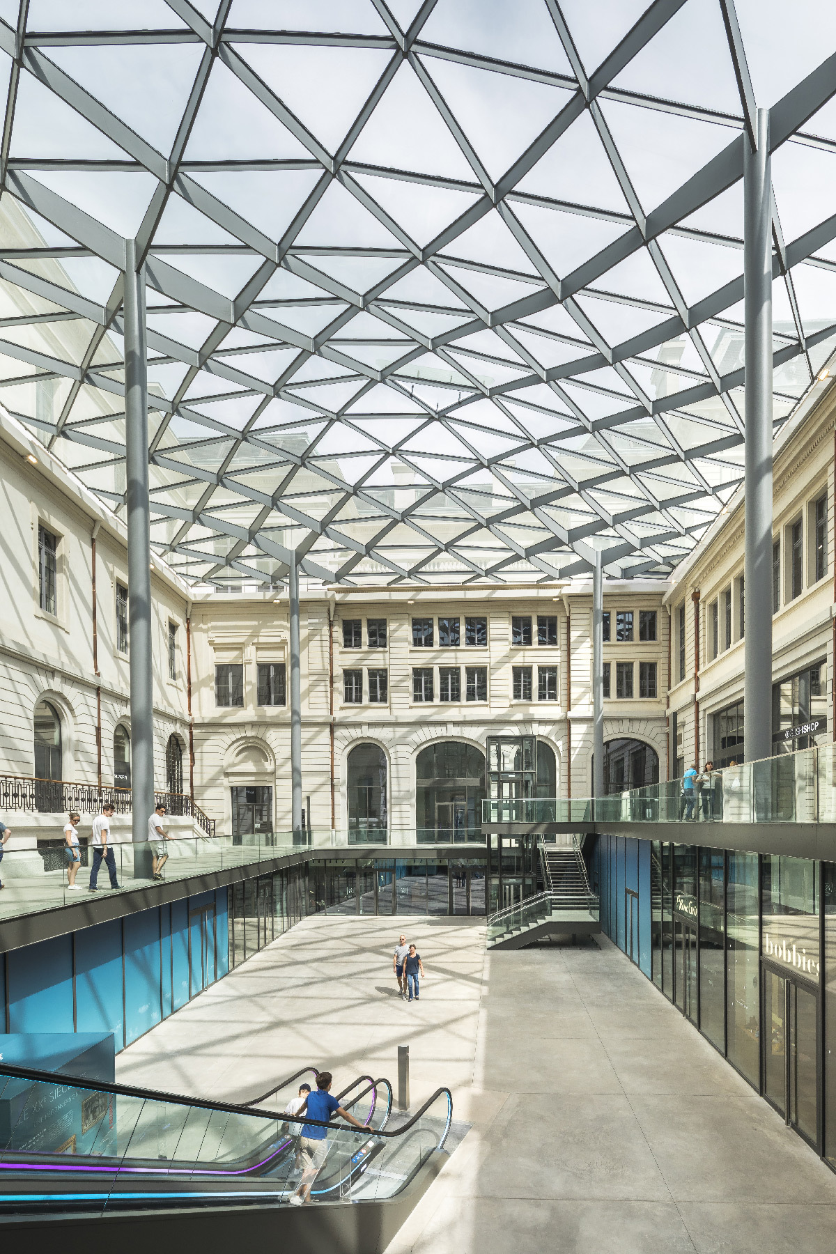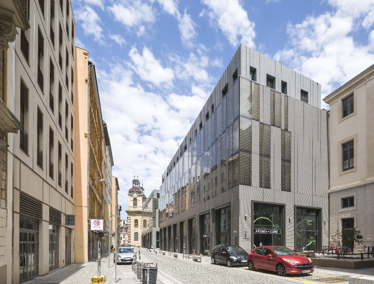 En référence au tissage lyonnais, la verrière est « comme un voile de soie rigidifié » racontent les architectes Albert Constantin et Claire Bertrand, AIA Life Designers. Sa forme est une double courbure qui répond aux effets du vent, des façades en périphérie et au dôme Pascalon en surplomb.