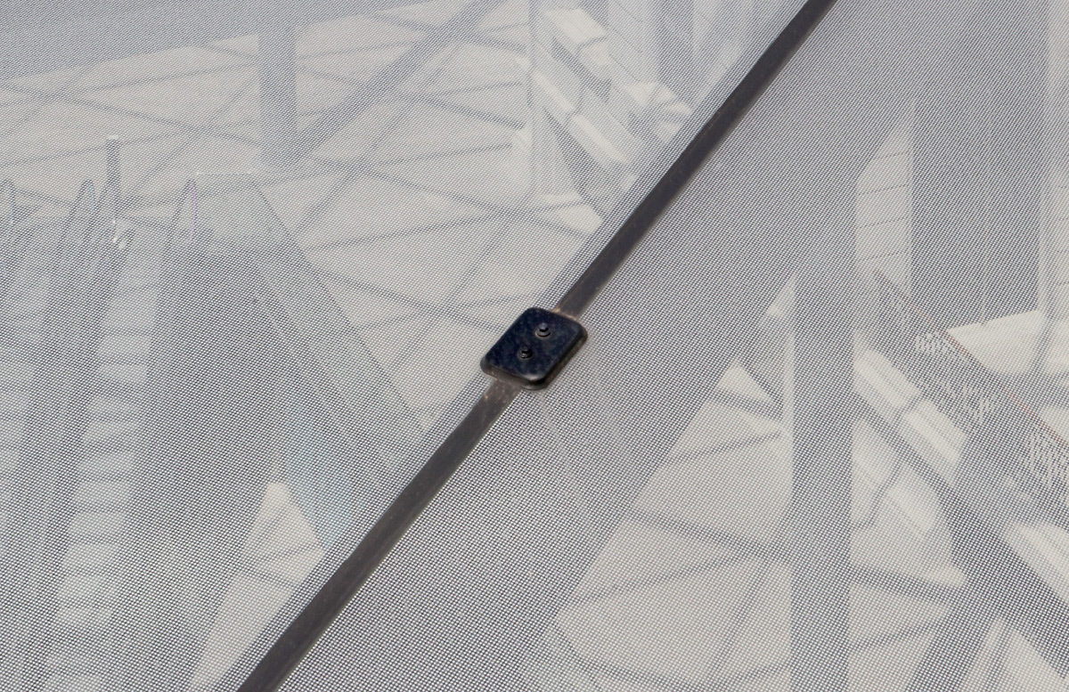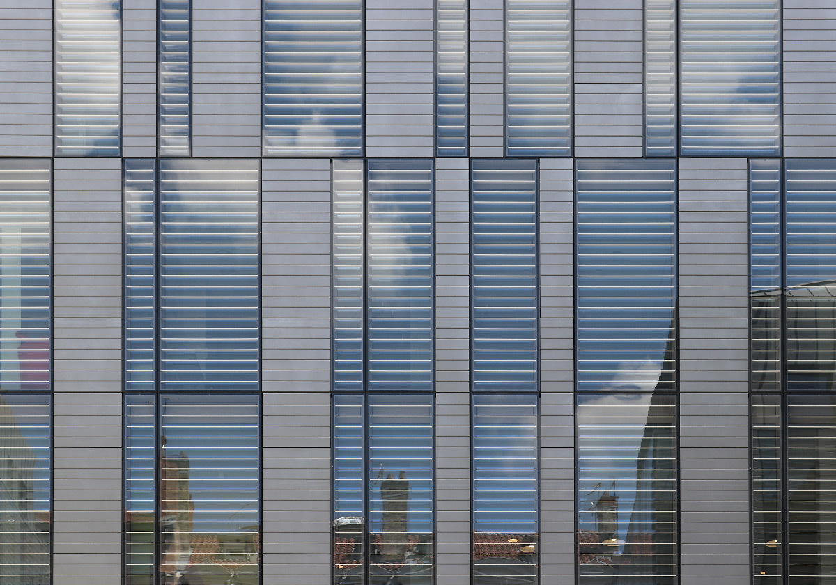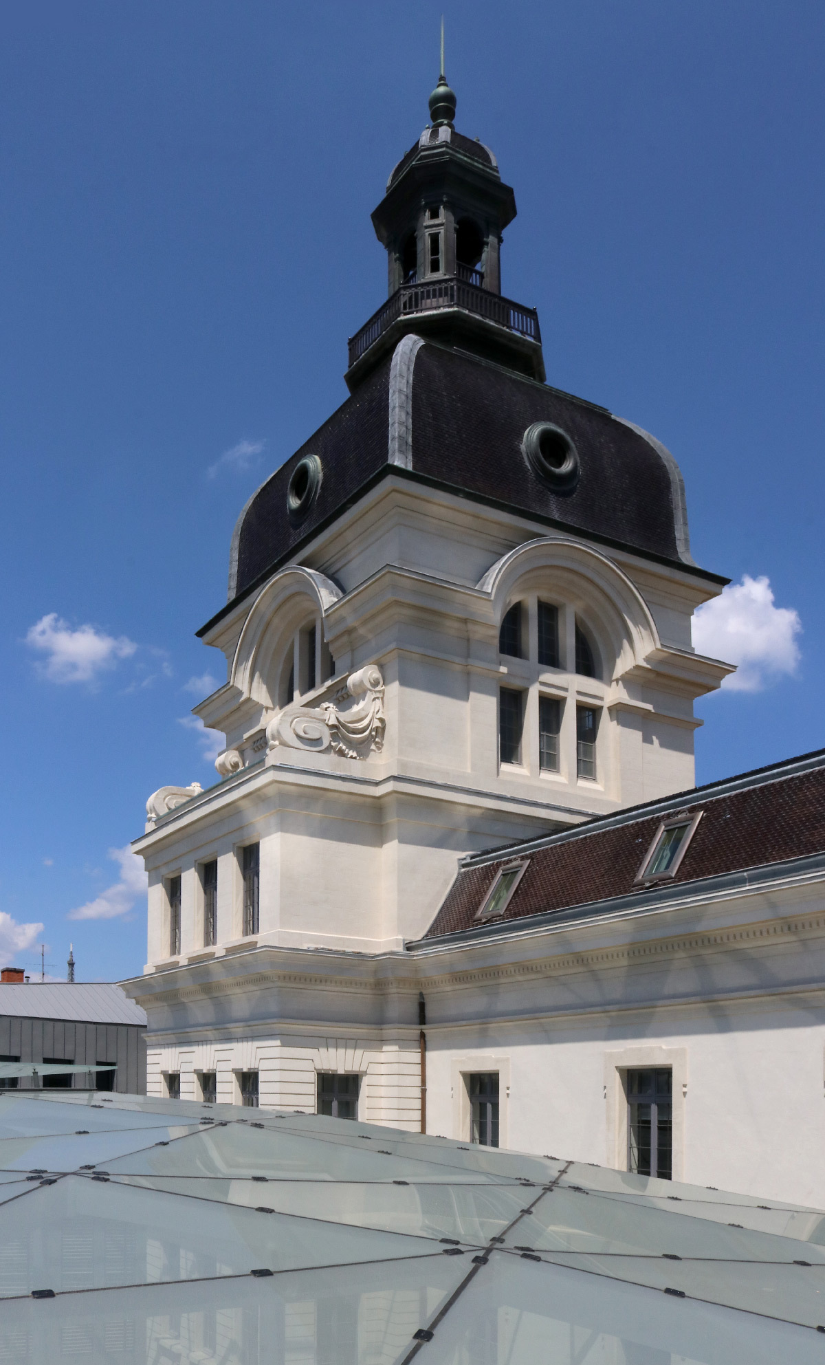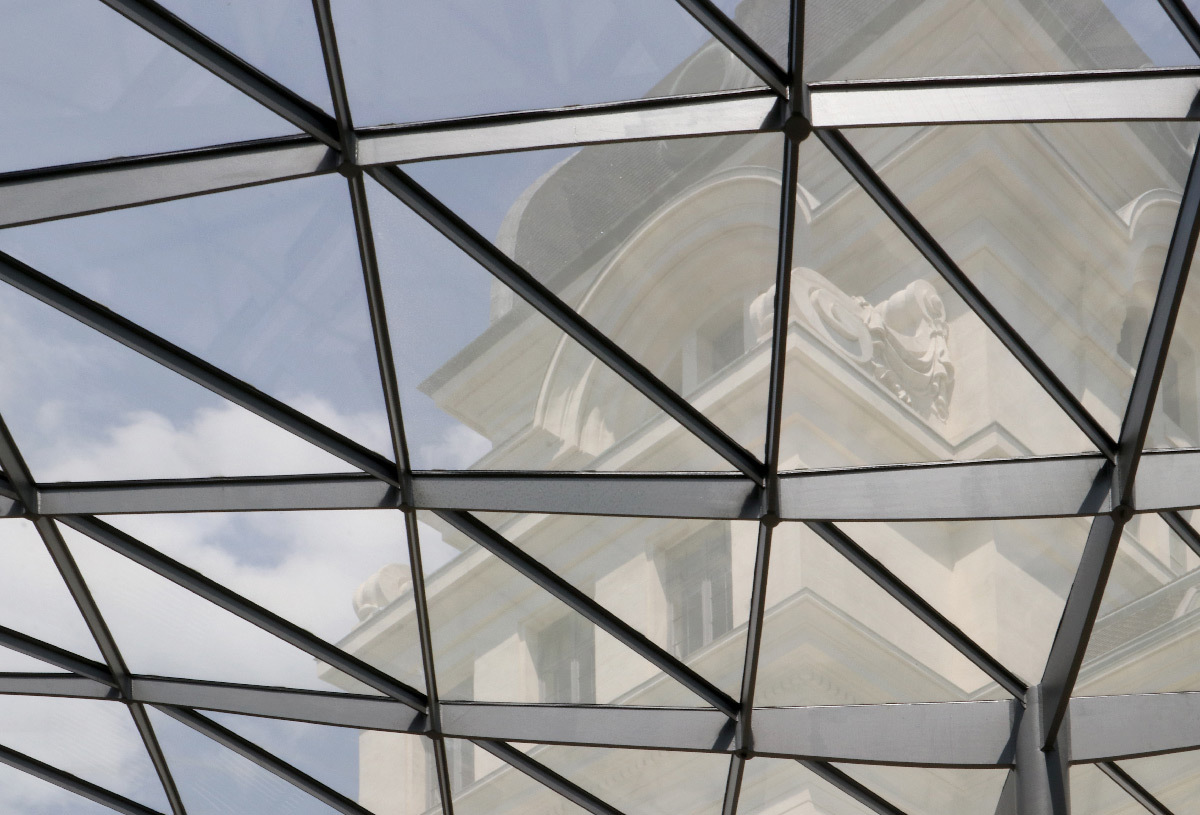 Le verre feuilleté sérigraphié en blanc par points, côté extérieur, a pour but d’assurer une protection solaire suffisante tout en gardant la transparence du patrimoine.