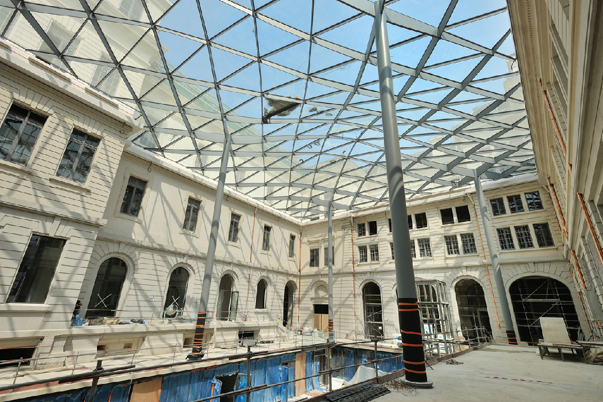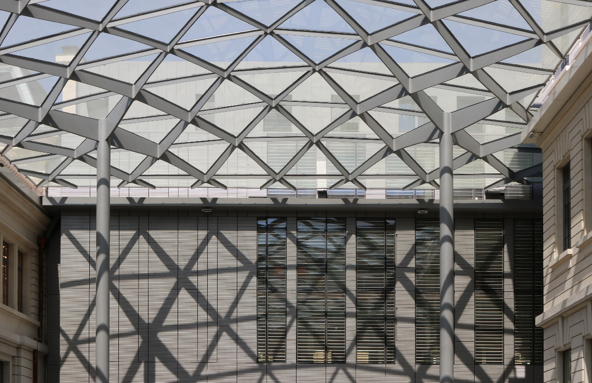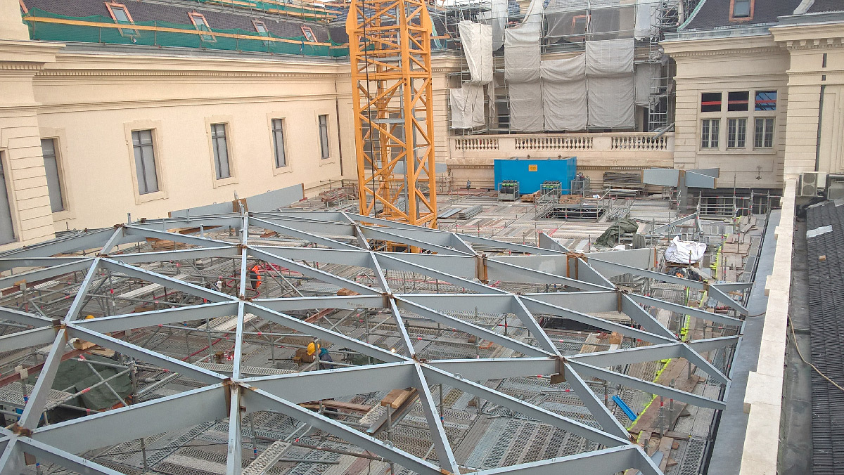 « De nombres itérations entre le maillage en plan et la géométrie 3D ont été nécessaires pour la développer » explique Pierre Chassagne, ingénieur structure de l’ouvrage. « C’est grâce à une image 3D que l’on a pu justifier la verrière de la cour » car, sa forme trapézoïdale avec des corniches à altimétries variées est complexe.