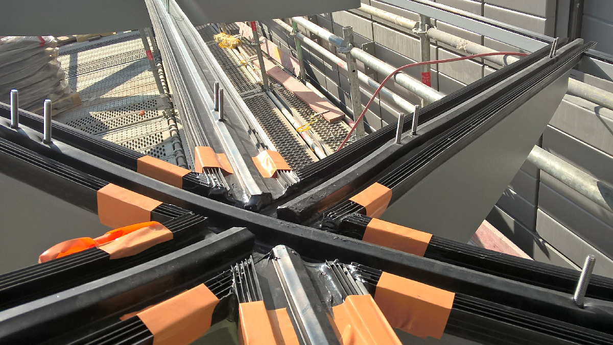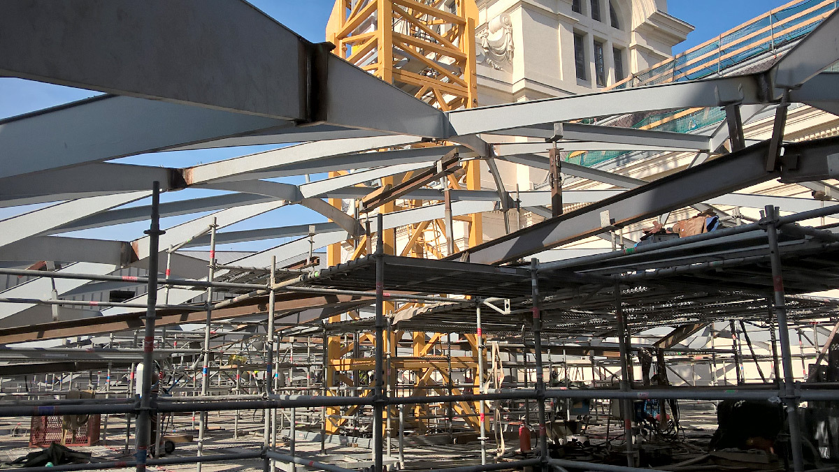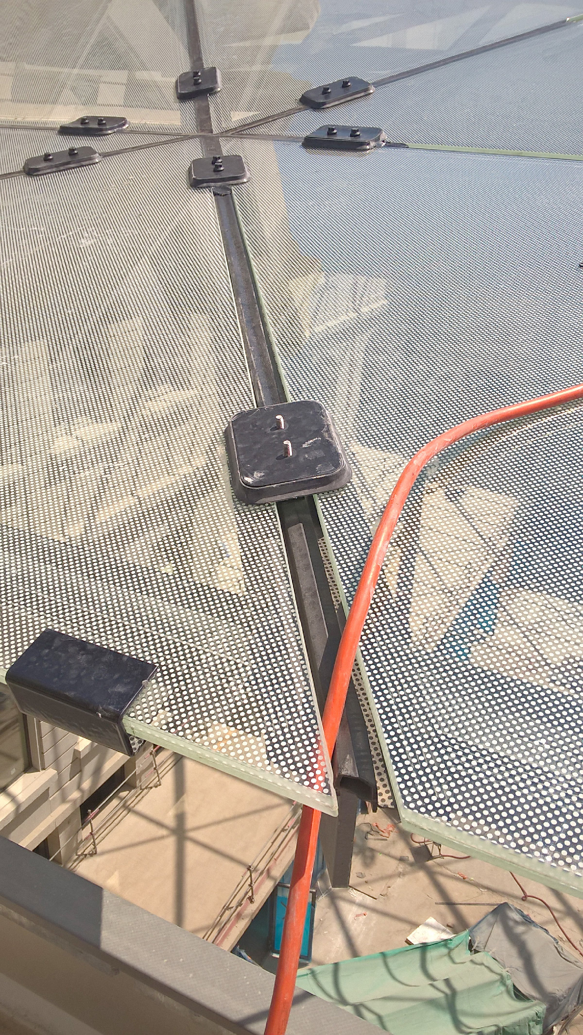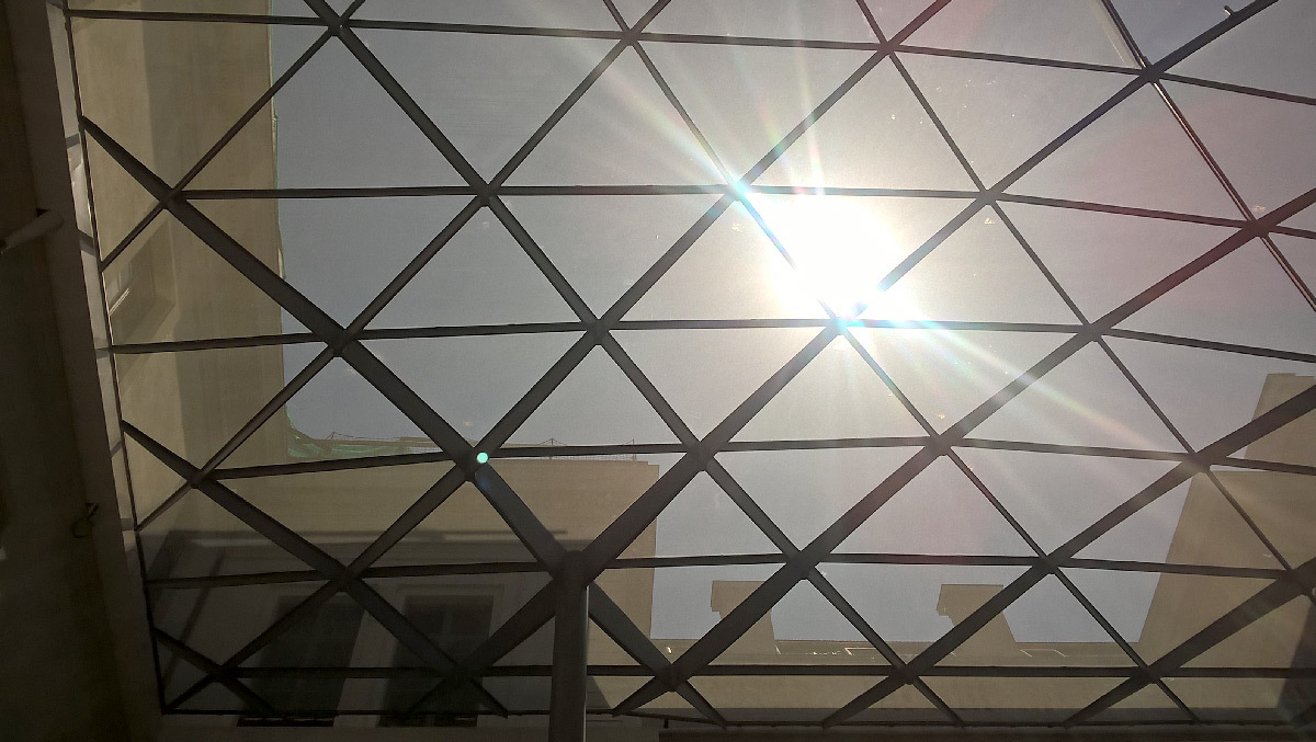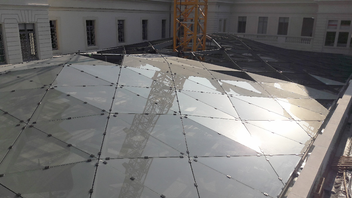 Tous les vitrages réalisés en Italie et les profilés métalliques sont découpés avant la pose. La verrière est entièrement soudée.