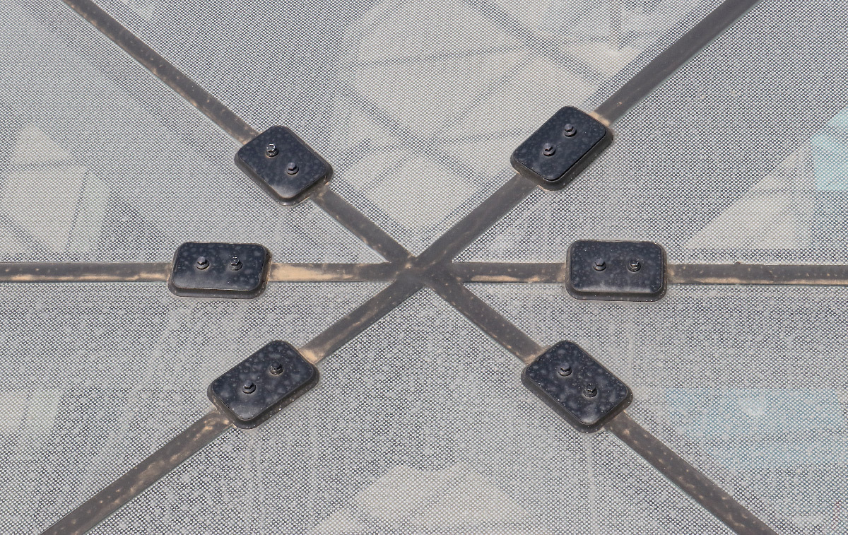 La verrière repose seulement sur six poteaux élancés de 50 cm de diamètre. Sa couverture légère, entre 16 à 18 mètres de haut, s’accomplit comme une vague à deux dômes triangulés.